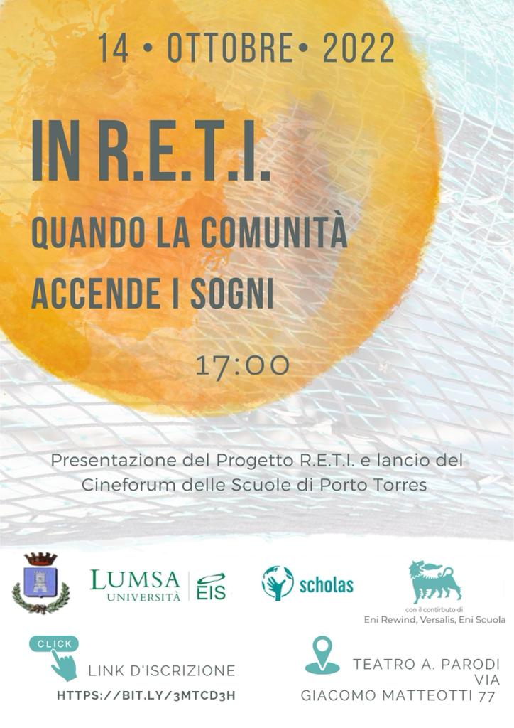 Il 14 ottobre 2022 dalle ore 17.00 alle ore 19.15 si terrà presso il Teatro A. Parodi di Porto Torres il Convengo "In R.E.T.I.: quando la comunità accende i sogni" organizzato dalla Scuola di Alta Formazione Educare all'Incontro e alla Solidarietà EIS dell'Università LUMSA di Roma, in collaborazione con il Comune di Porto Torres, la Fondazione Scholas Occurrentes, l'associazione Camera Chiara e i due Istituti Compresivi del territorio. Il progetto è stato realizzato con il contributo di Eni rewind e Versalis, in partnership con Eniscuola.