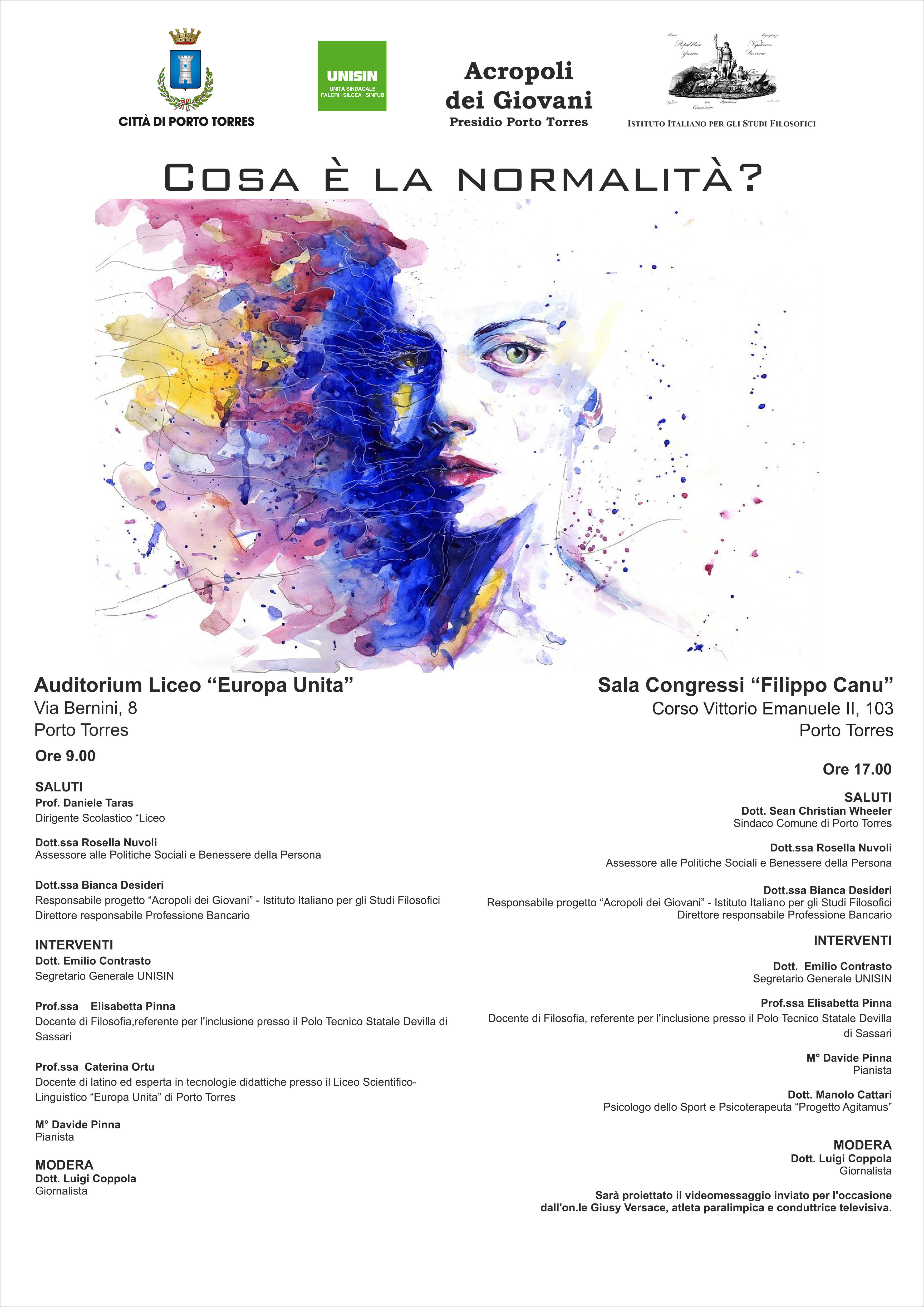 La disabilità vissuta nella società, nello sport e nella musica, nel solco dell’esempio di chi la affronta quotidianamente con coraggio e caparbietà. Sono alcuni dei temi che verranno toccati nel corso del convegno “Cosa è la normalità?” che si terrà la mattina al Liceo Scientifico. Tante le testimonianze, le riflessioni e i contributi degli esperti, più uno speciale video messaggio di Giusy Versace, già atleta paralimpica e conduttrice televisiva, oggi deputata della Repubblica. L’iniziativa è organizzata dal Comune di Porto Torres e dall’lstituto Italiano per gli Studi Filosofici che promuove la cultura e la formazione dei giovani. L’Amministrazione e l’istituto sono sottoscrittori di un’intesa attraverso la quale è stato creato in città il Presidio dell’Acropoli dei Giovani, che realizza iniziative per sviluppare una nuova coscienza.