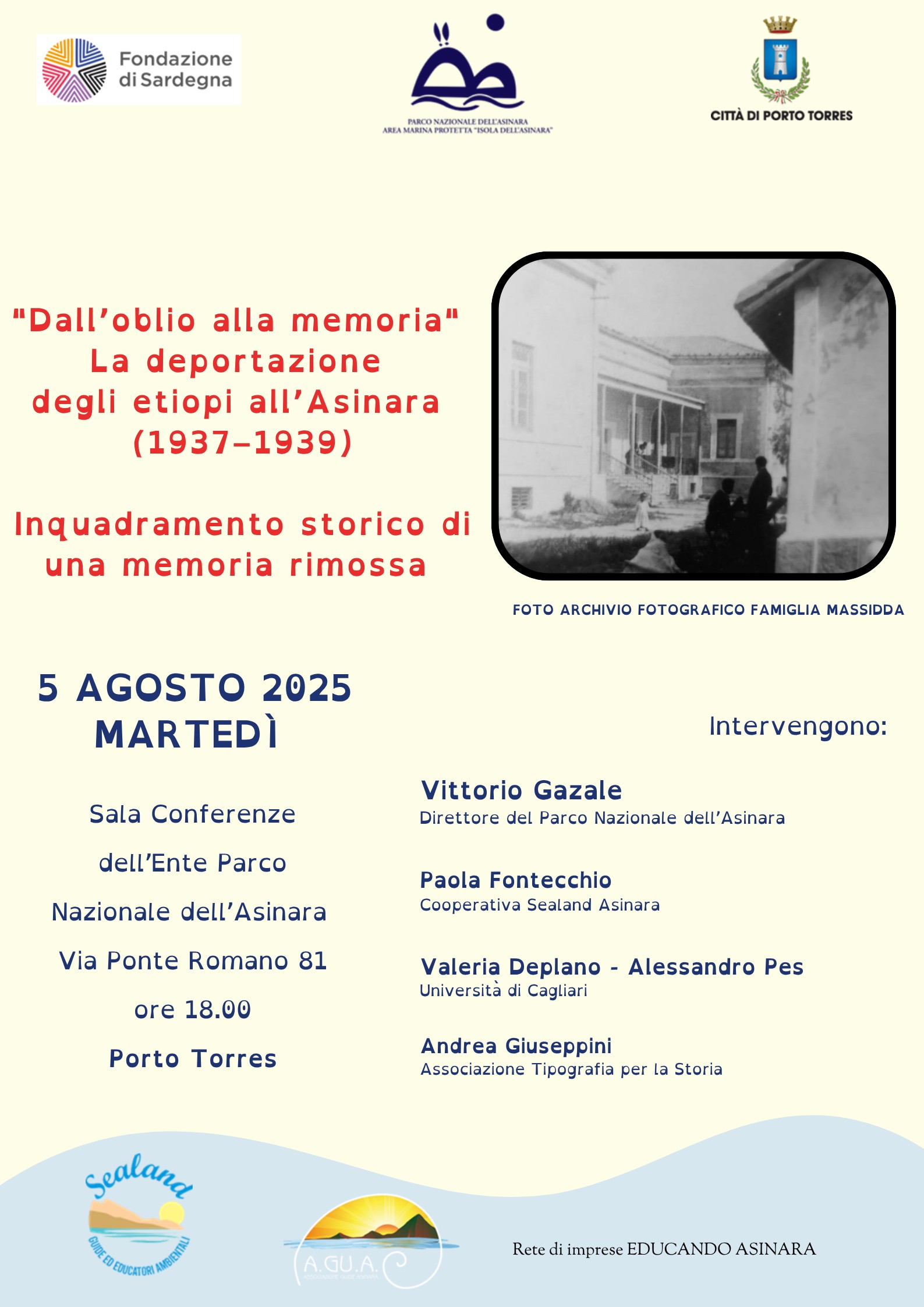 Prende il via il progetto “Dall’Oblio alla Memoria. Storia dei deportati etiopi all’Asinara (1937–1939)”, un’importante iniziativa storico-culturale dedicata al recupero della memoria di un episodio tragico e a lungo ignorato del colonialismo italiano: la deportazione sull’isola dell’Asinara di oltre 300 cittadini etiopi, tra cui alti funzionari dell’Impero etiope, ambasciatori, ministri e le loro famiglie.
