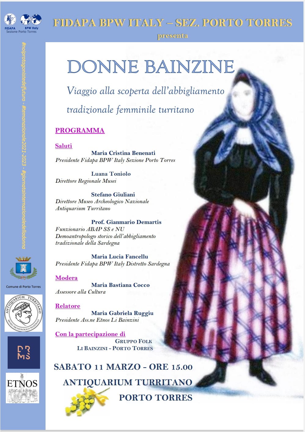 Saranno protagoniste del convegno le “donne Bainzine” che indosseranno tutte le fogge dell’abbigliamento femminile tradizionale di Porto Torres, che verranno puntualmente descritte nelle loro varie componenti, contestualizzando la descrizione con la spiegazione dell’utilizzo delle diverse tipologie di abbigliamento in relazione alle diverse categorie sociali e ai diversi momenti della vita quotidiana. Ci si soffermerà sui tessuti utilizzati e sulle similitudini con l’abbigliamento tradizionale femminile dei centri limitrofi.