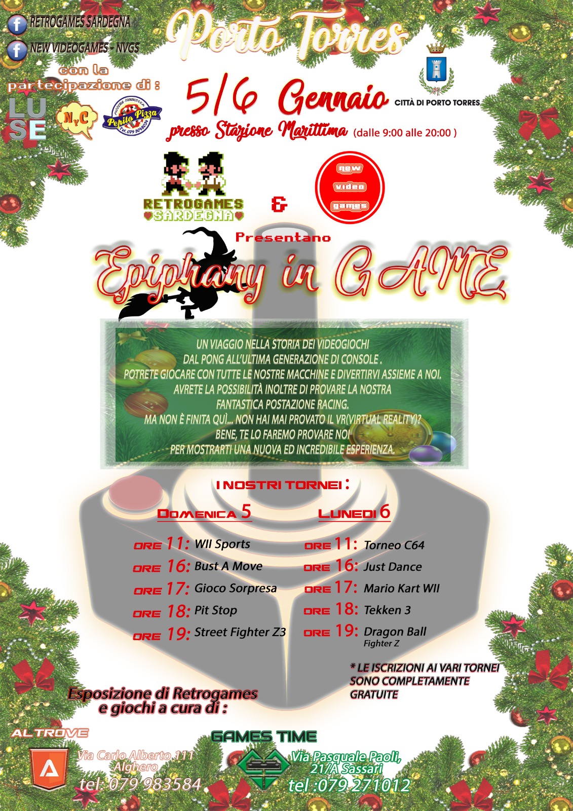 Da non perdere i tornei! Domenica 5 gennaio: Wii Sports (ore 11); Bust a move (ore 16); Gioco sorpresa (ore 17); Pit Stop (ore 18); Street Fighter Z3 (ore 19). Lunedì 6 gennaio: Torneo C64 (ore 11); Just Dance (ore 16); Mario Kart Wii (ore 17); Tekken 3 (ore 18); Dragon Ball Fighter Z (ore 19).