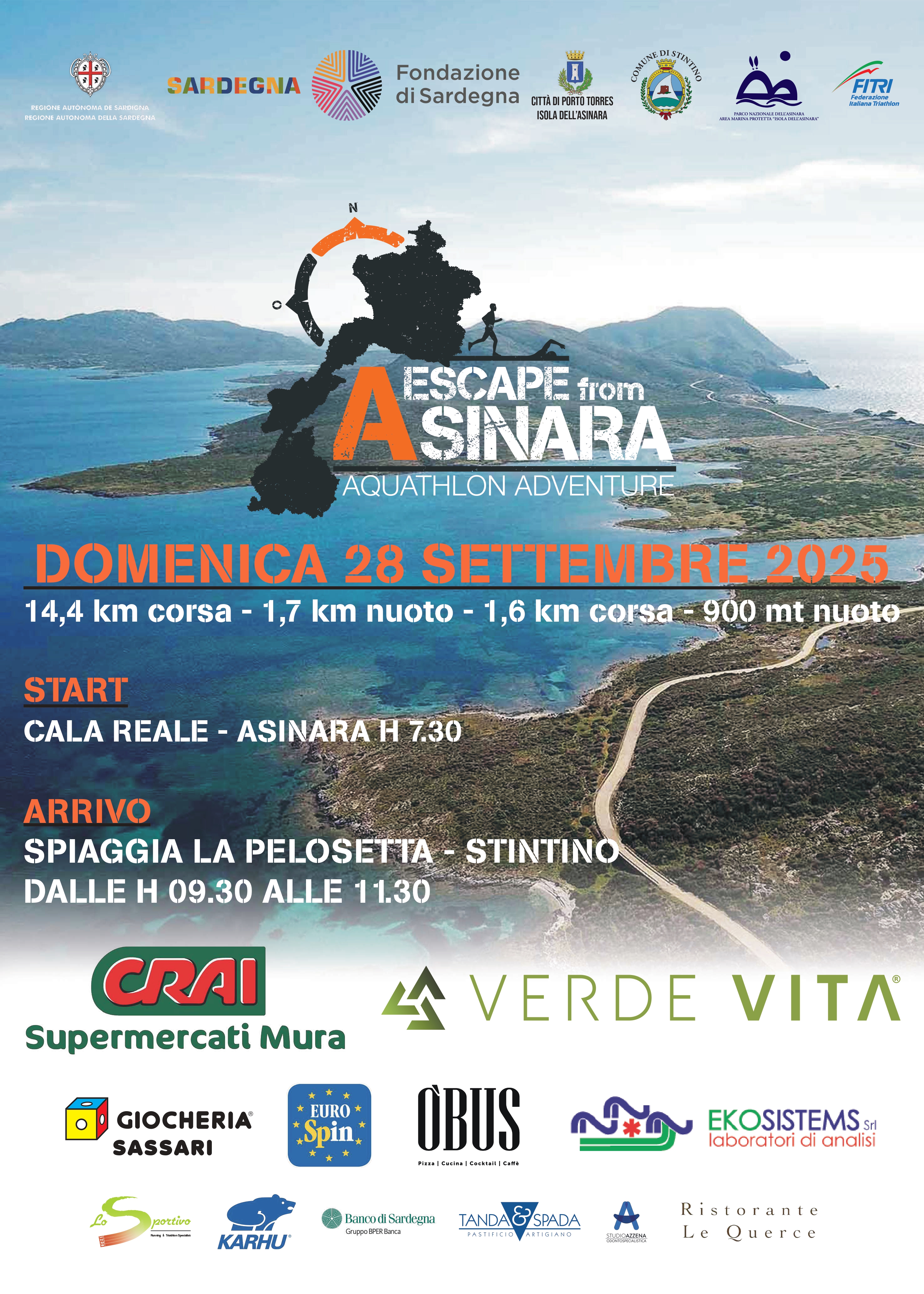 Partendo da Cala Reale gli atleti percorreranno 14,4 km dell’unica strada cementata fino a Fornelli, dove nella zona cambio appositamente adibita, ciascun atleta troverà il necessario per la prima frazione di nuoto (cuffia, occhialini e una boa) fornito dall’organizzazione. Da Fornelli gli atleti proseguiranno l’avventura nuotando per di circa mt. 1700 nello spazio d’acqua tra Fornelli e l’isola Piana e una volta giunti sull’isoletta si cimenteranno nella seconda frazione di corsa di circa Km. 1,4 su un percorso selvaggio ma tracciato, che li porterà nella spiaggia dell’Imbarcatogio, da dove gli atleti proseguiranno per la seconda frazione di nuoto di circa mt. 900, verso la spiaggia de La Pelosetta, dove è posizionato l’arrivo.