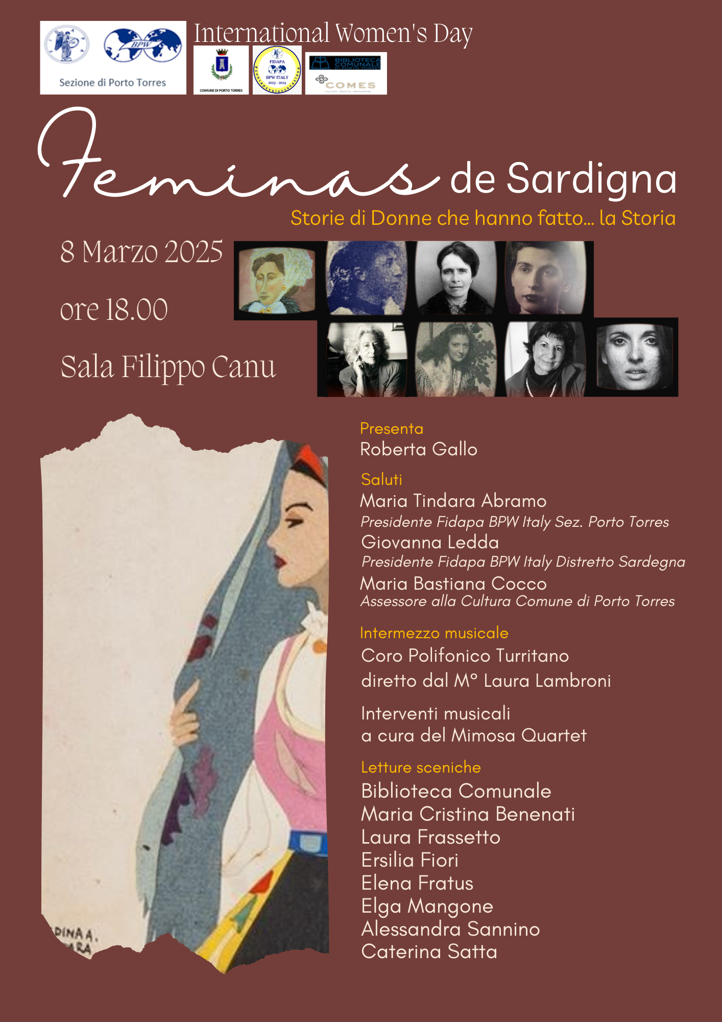 Dopo il successo dello scorso anno, si omaggeranno altre otto donne di Sardegna - nate tra il XVIII e il XX secolo - che hanno contribuito in maniera determinante alla crescita culturale, scientifica, spirituale, artistica e politica della Sardegna: Donna Francesca Sanna Sulis, Maria Manca Colombo, Edvige Carboni, Toiedda Meloni, Nereide Rudas, Fulvia Riccardino, Maria Carta, Maria Giacobbe rievocate attraverso letture sceniche, a cura di Roberta Gallo e del collettivo della Biblioteca comunale di Porto Torres – Comes.