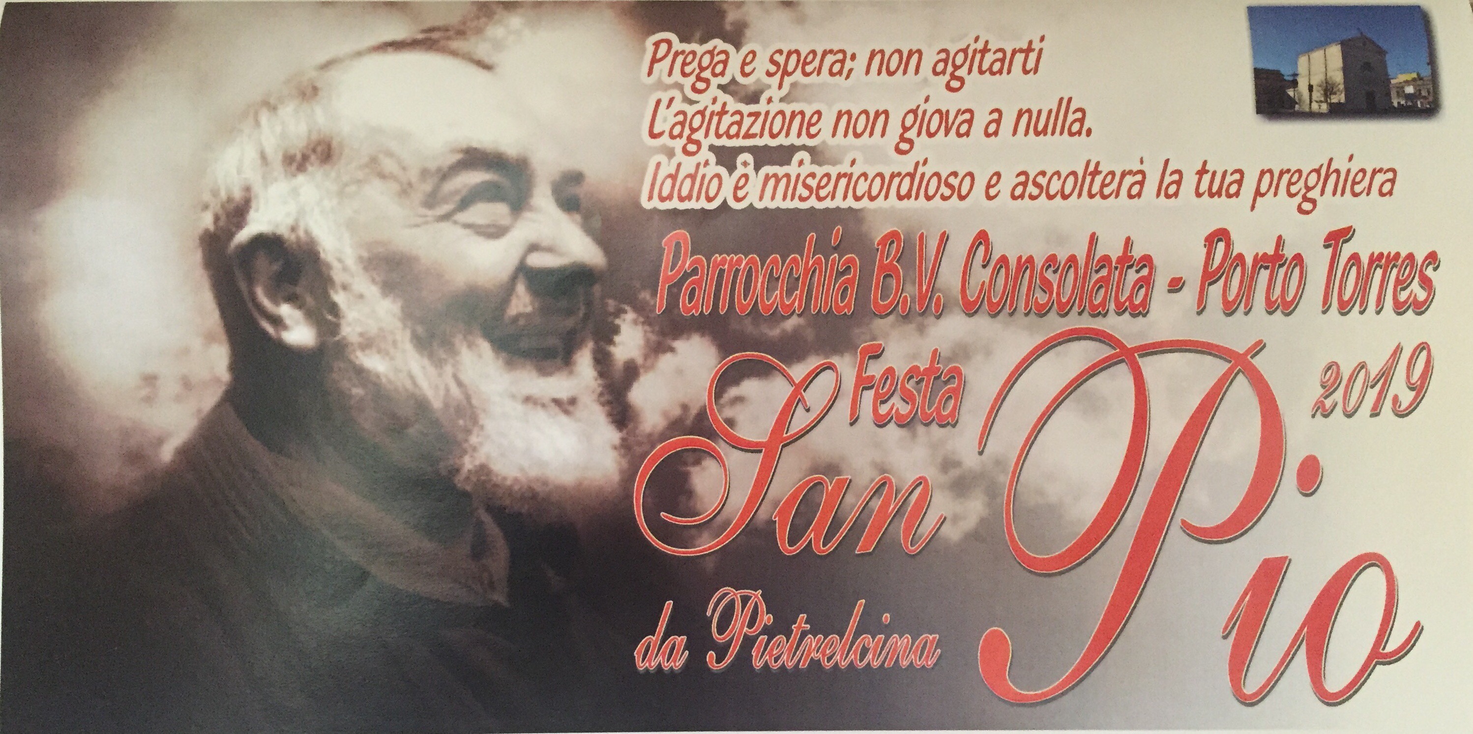 La chiesa della B.V. della Consolata ospita il 22 e 23 settembre la Festa di San Pio. Il programma prevede domenica la celebrazione della Santa Messa alle ore 10:00 e alle 11:00. Alle 17:30 il santo Rosario e i Vespri, seguiti alle ore 18:00 dalla Messa Solenne con la Processione del simulacro del Santo portato a spalla dai Vigili del Fuoco di Porto Torres. Partecipa il Gruppo Folk Porto Torres dell'Associazione Intragnas.