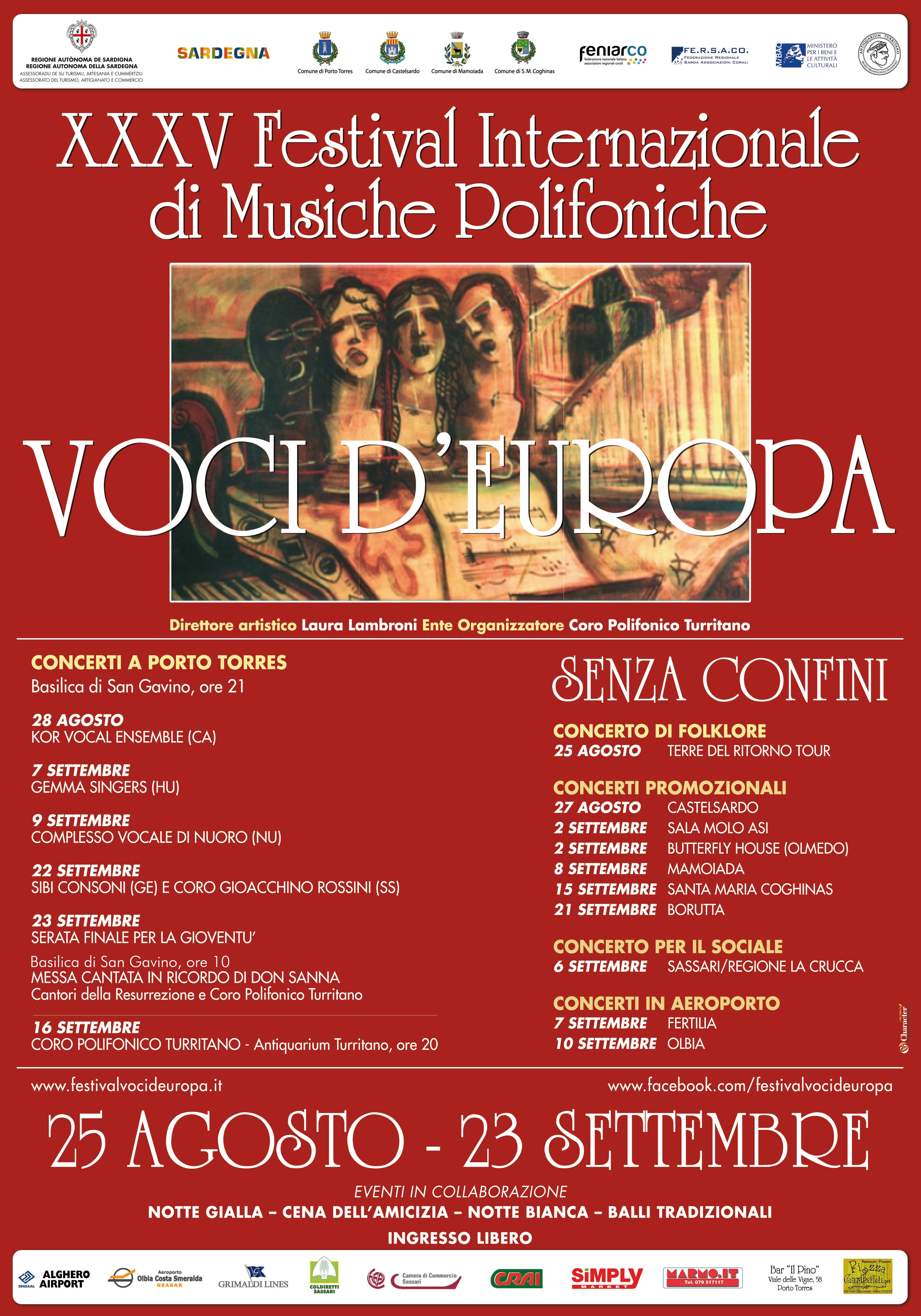 Il Festival Internazionale di Musiche Polifoniche “Voci d’Europa” è organizzato dal Coro Polifonico Turritano (Presidente Maria Maddalena Simile), con la direzione artistica del Maestro Laura Lambroni. Presenta le serate la giornalista Luciana Satta. L’evento si avvale del contributo e del patrocinio di: Regione Autonoma della Sardegna - Assessorato al Turismo Artigianato e Commercio, Comune di Porto Torres, Comune di Castelsardo, Comune di Santa Maria Coghinas, Comune di Mamoiada, Aeroporto Alghero Sogeaal, Aeroporto Olbia Costa Smeralda Geasar, Antiquarium Turritano, Butterfly House Olmedo, Coldiretti, Cooperativa Alle Cascine - La Crucca, Bar Il Pino, Grimaldi Group SpA, MARMO.IT srl, Centro Commerciale I Granai Turrismarket, Cooperativa Alle Cascine La Crucca, Bricofer Spa, Demoltorres srl.