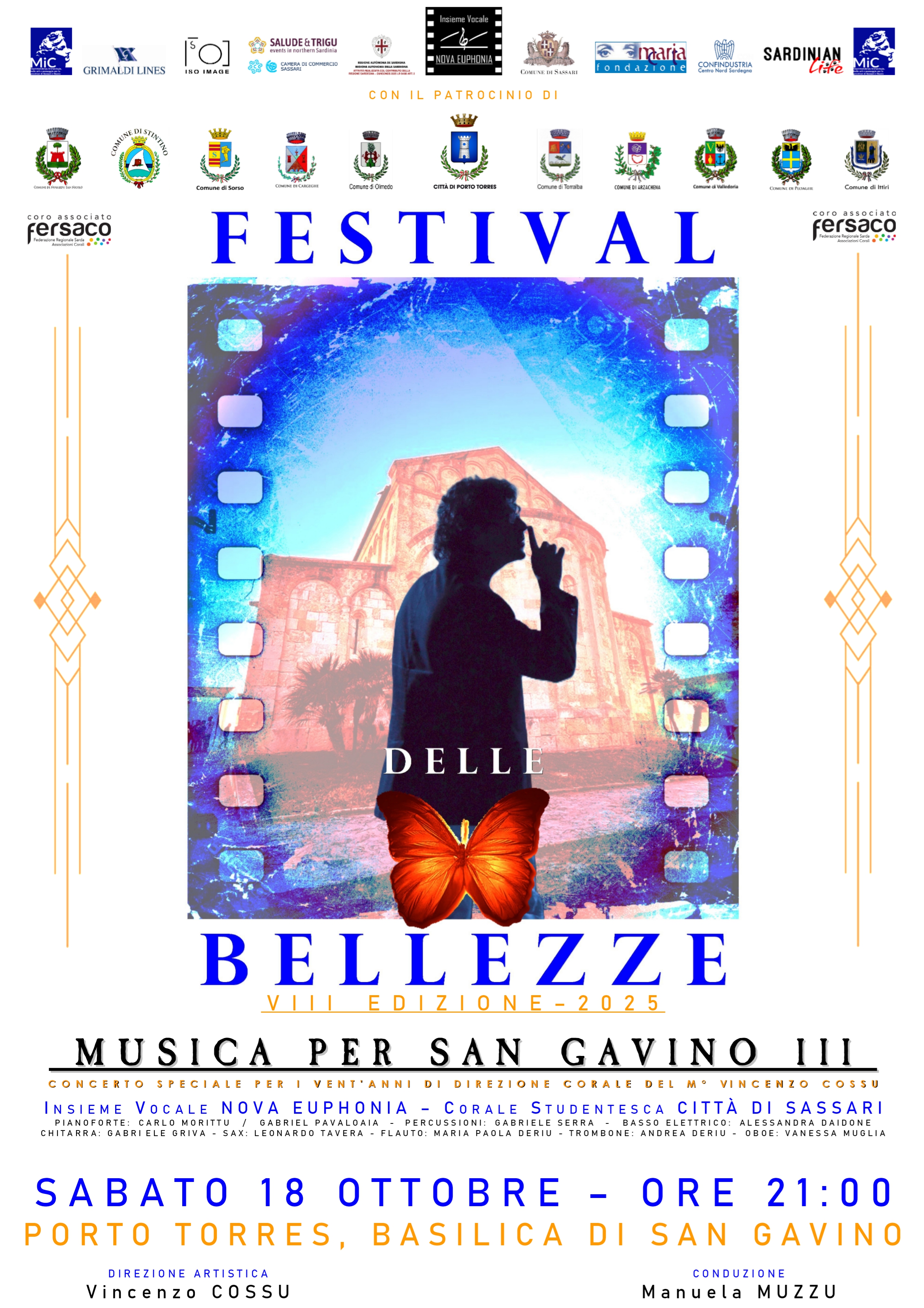 Sabato 18 ottobre alle ore 21:00 il Festival delle Bellezze tornerà alla basilica dei Santi Gavino, Proto e Gianuario di Porto Torres con una tappa della sua ottava edizione. Per l’occasione i coristi, solisti e strumentisti dell’Insieme Vocale Nova Euphonia e della Corale Studentesca Città di Sassari si produrranno in un concerto di musiche sacre, sarde e da cinema: in programma brani di Mozart, Queen, John Williams, Morricone, Tazenda e molti altri. Lo spettacolo sarà anche l'occasione per festeggiare pubblicamente i 20 anni di direzione corale del M° Vincenzo Cossu. Oltre al patrocinio del Comune di Porto Torres sarà sostenuto dalla Camera di Commercio di Sassari attraverso il brand Salude & Trigu.