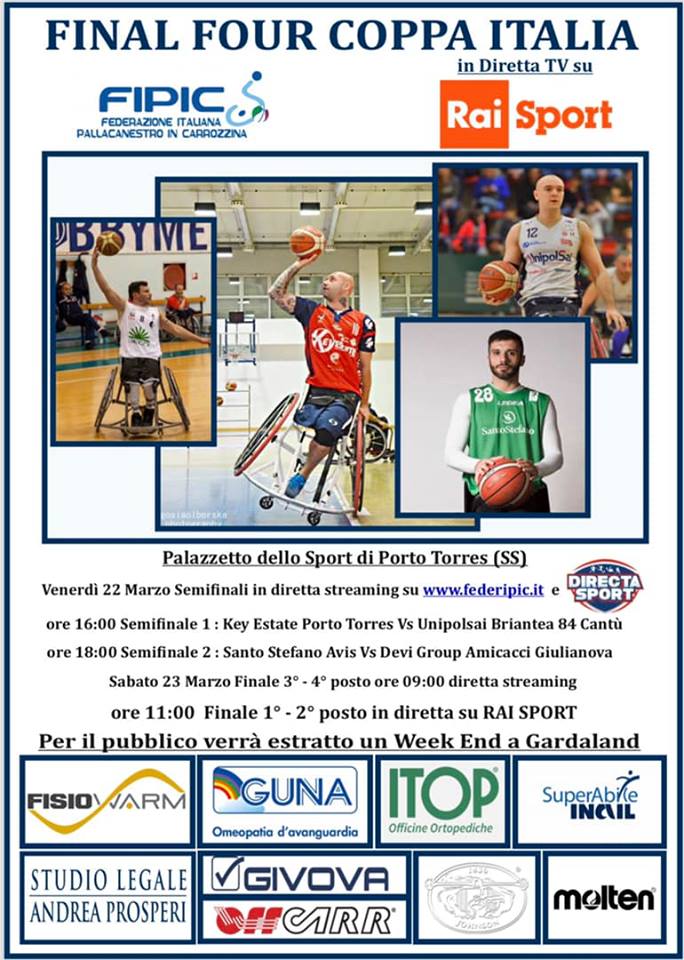 Venerdì 22 e sabato 23 marzo si disputerà la Final Four della venticinquesima Coppa Italia di basket in carrozzina. A contendersi il trofeo le prime quattro della classifica del campionato di Serie A dopo il girone di andata: UnipolSai Briantea 84 Cantù, S. Stefano Avis, Deco Group Amicacci Giulianova e Key Estate Porto Torres.