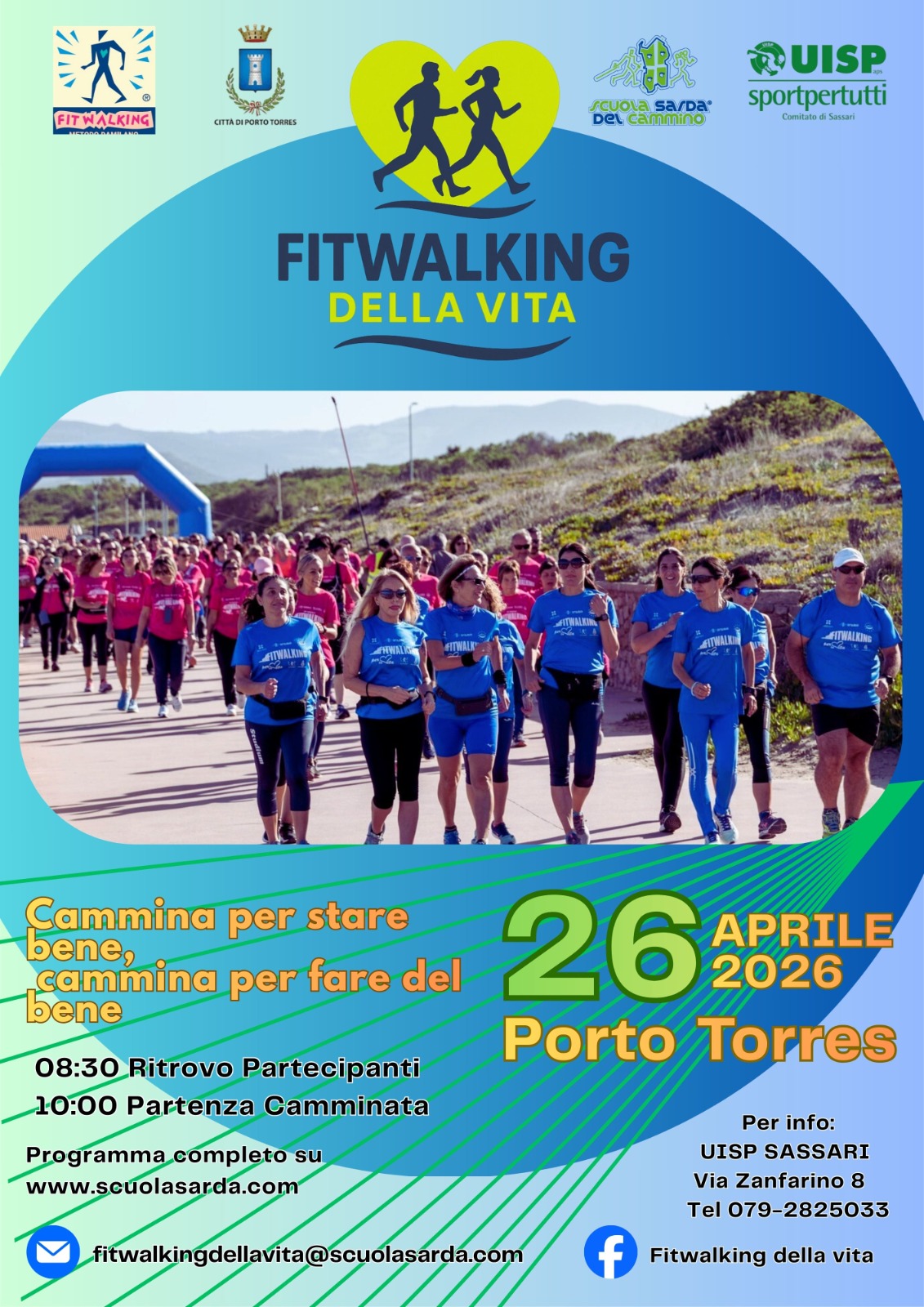 Nasce con l’obiettivo di diffondere sempre di più la cultura del cammino come stile di vita attivo e consapevole. È il "Fitwalking della Vita”, un nuovo format dedicato alla promozione del movimento come strumento di salute, prevenzione, benessere e solidarietà, in programma sabato 25 e domenica 26 aprile nel litorale turritano con ritrovo, partenza e arrivo in Piazza Eroi dell’Onda.