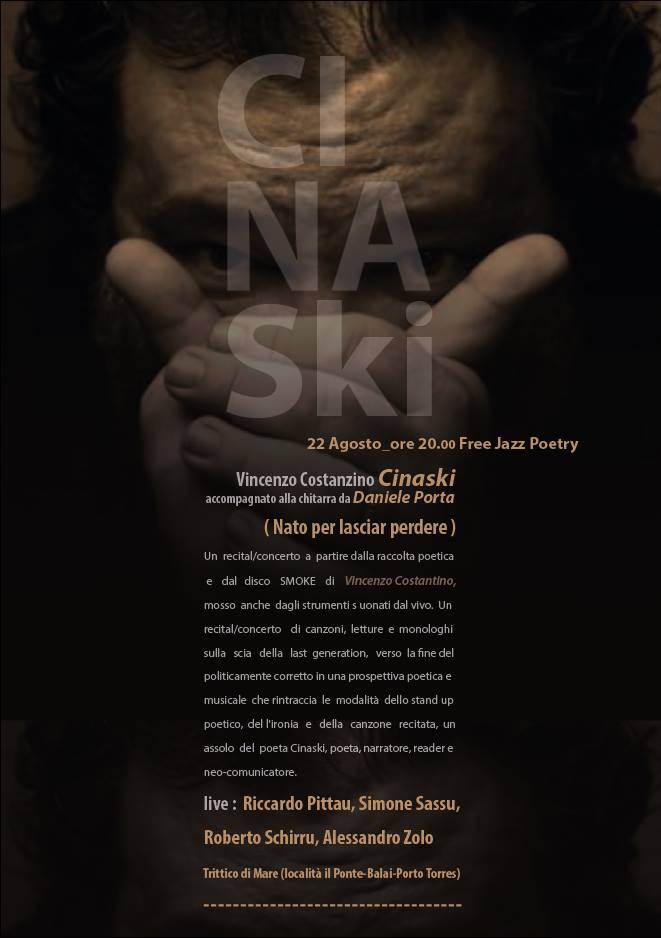 Si alterneranno durante la giornata tre momenti sonori: uno tardo pomeridiano sarà guidato da un trio di giovani studenti del conservatorio, contrabbasso, pianoforte e sax, a loro il difficile compito di rompere il ghiaccio e anticipare l'ospite d'oltremare della serata, il secondo dei tre momenti: il poeta milanese Vincenzo Costantino, in arte Cinaski, accompagnato dal suo fidato chitarrista elettrico nell'ultimo lavoro “Nato per lasciar perdere”.