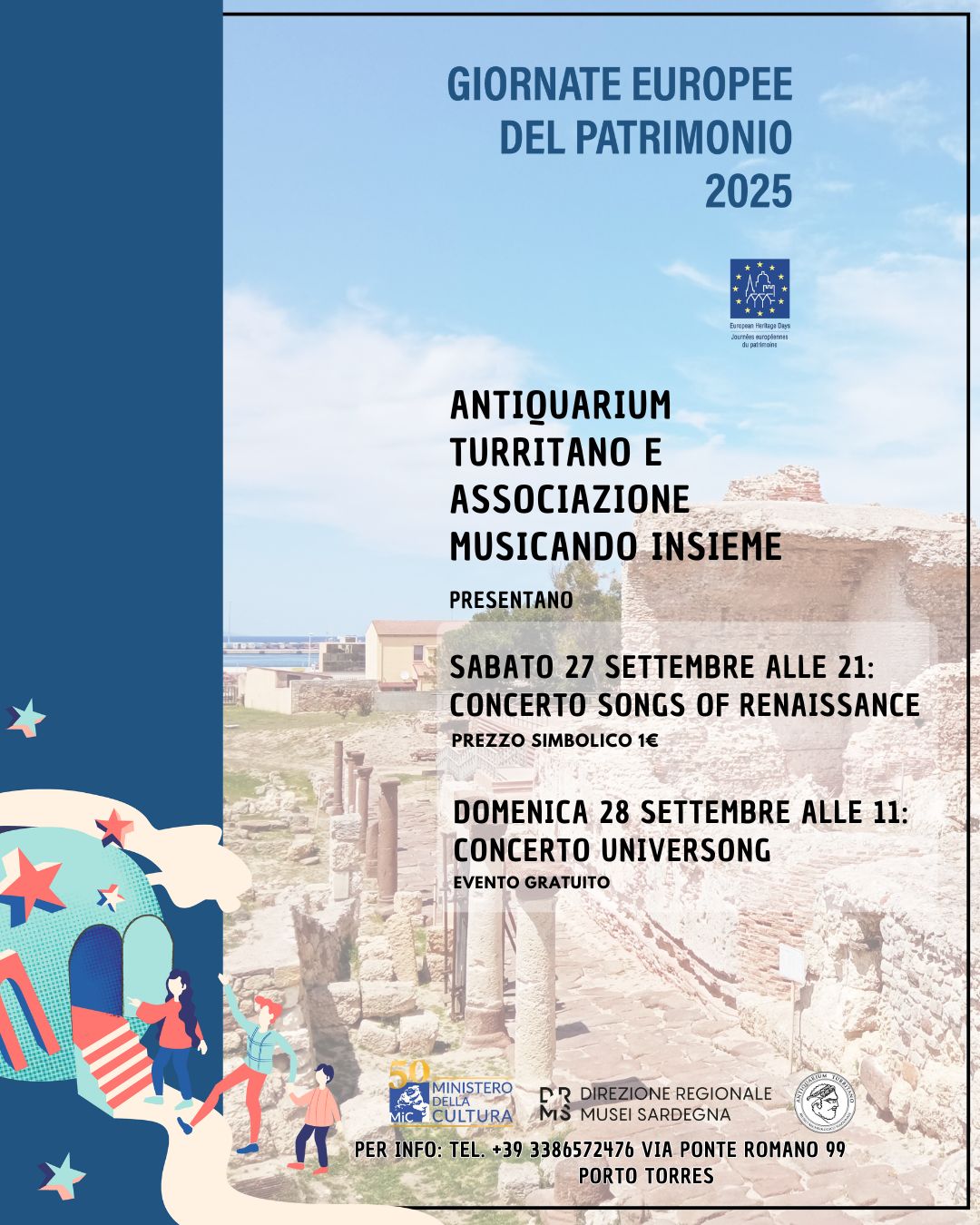 In occasione delle Giornate Europee del Patrimonio 2025, l’Antiquarium Turritano in collaborazione con l’Associazione “Musicando Insieme”, vi invita all’ascolto e alla visione di due concerti, nella serata di sabato 27 e domenica mattina del 28 settembre.