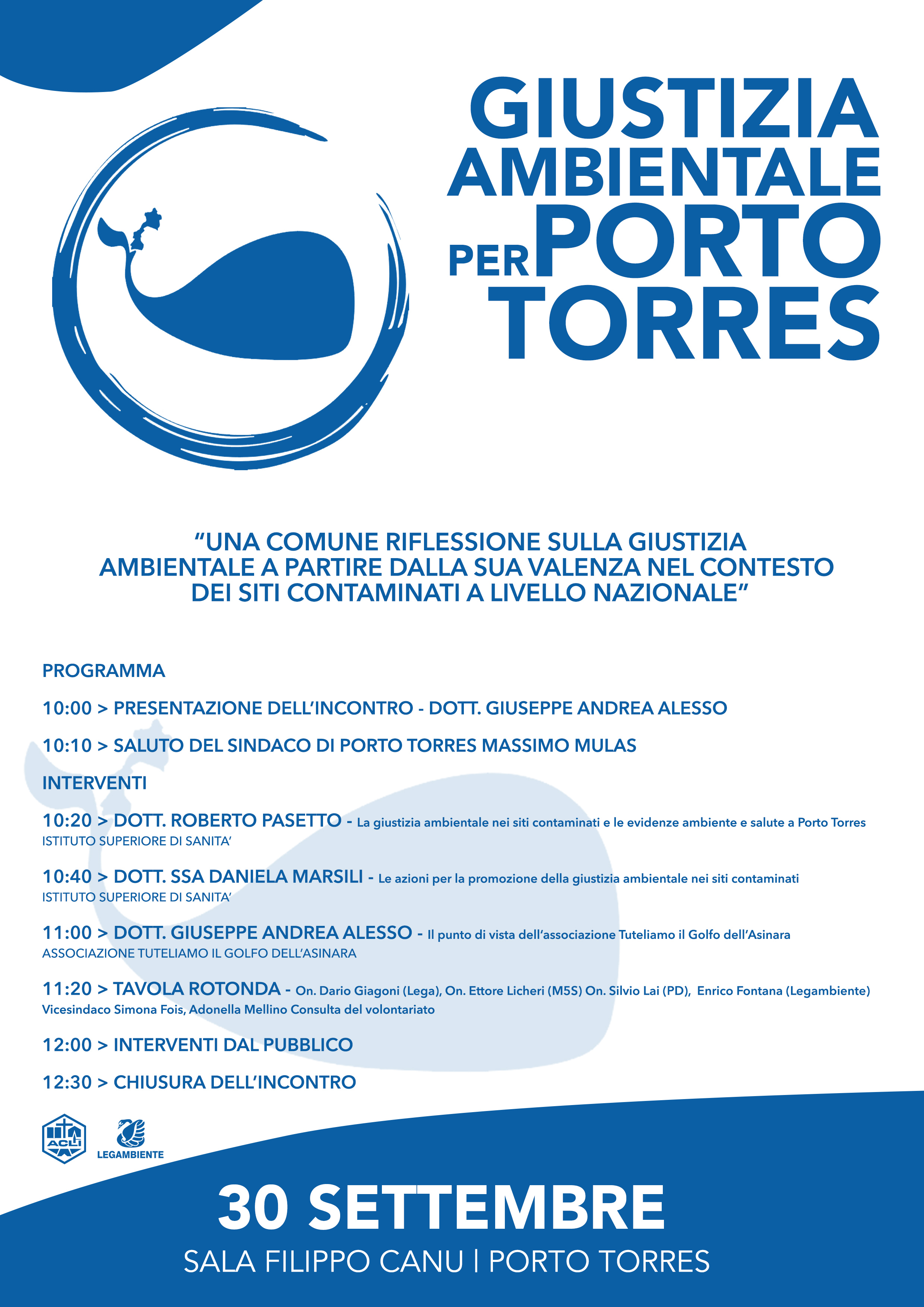 ore 11:00 La giustizia ambientale a Porto Torres secondo il punto di vista dell’Associazione Tuteliamo il Golfo dell’Asinara Dott. Giuseppe Andrea Alesso