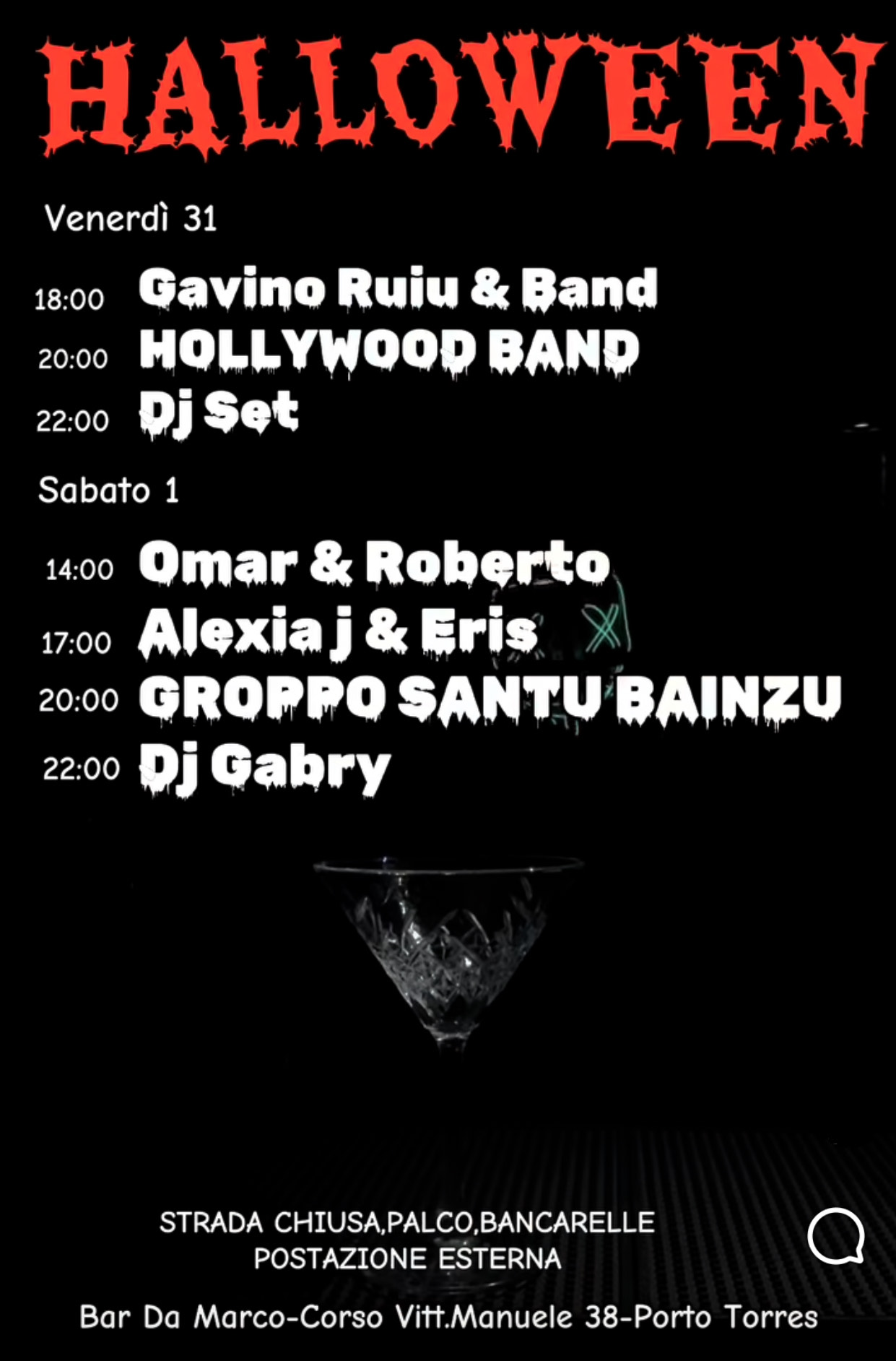 In occasione della festività di Halloween il Bar da Marco si veste a festa per due giorni di musica e divertimento, luogo d’incontro di diverse fasce d’età, nella zona nevralgica della nostra città. Sul palco fronte bar si esibiranno con inizio venerdì alle 18.00 Gavino Ruiu e la sua band. A seguire la Hollywood band per il gran finale. DJ set a chiusura della giornata. Sabato si inizierà dalle 12.00 con le note folk di Omar & Roberto. Dalle 17:00 invece è il momento di Alexia J & Eris, mentre dalle 20.00 ci sarà il gruppo Santu Bainzu. Chiuderà la due giorni DJ Gabry. La direzione tecnica dell’evento è di Salvatore Fresu.