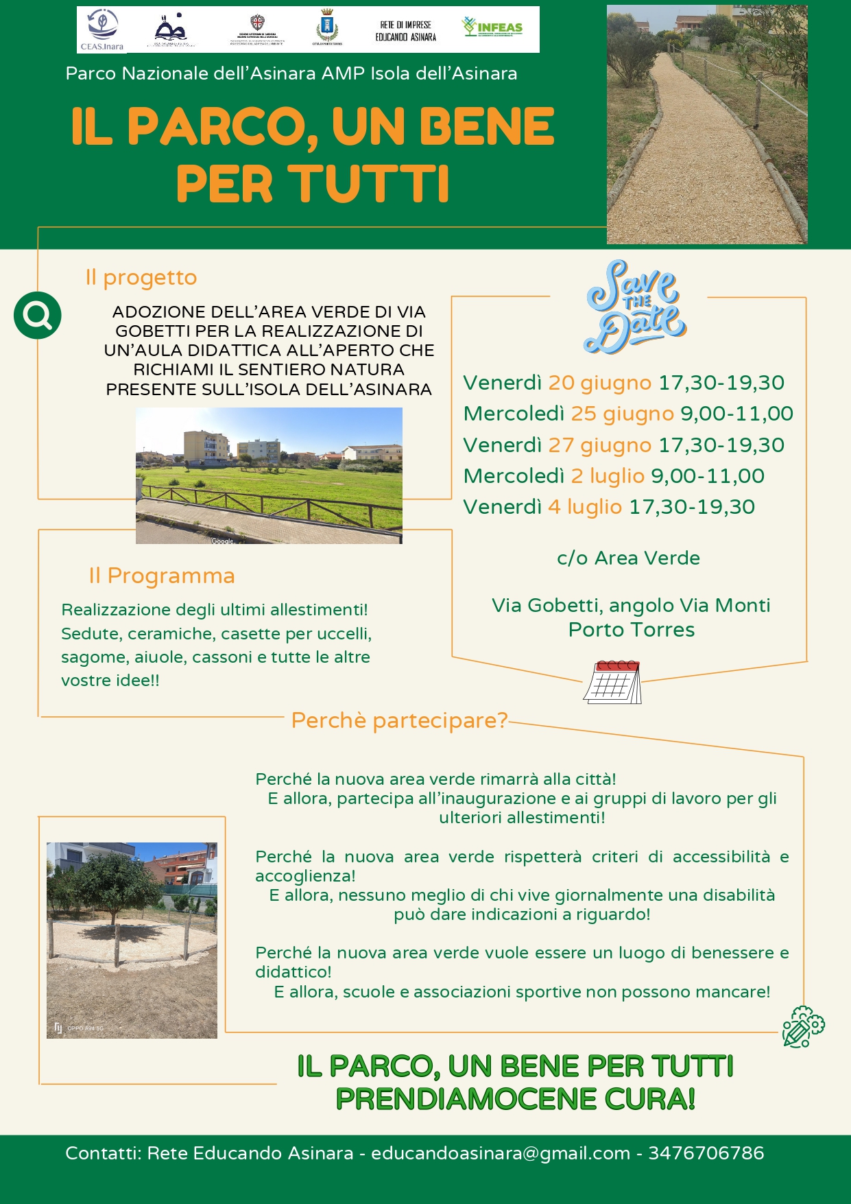 La Rete di Imprese Educando Asinara, che racchiude gli educatori ambientali del Parco, nell'ambito della Convenzione con il Parco per lo svolgimento delle attività di educazione ambientale e alla sostenibilità, ha l'incarico di sviluppare il progetto nell'area prescelta dal Comune.