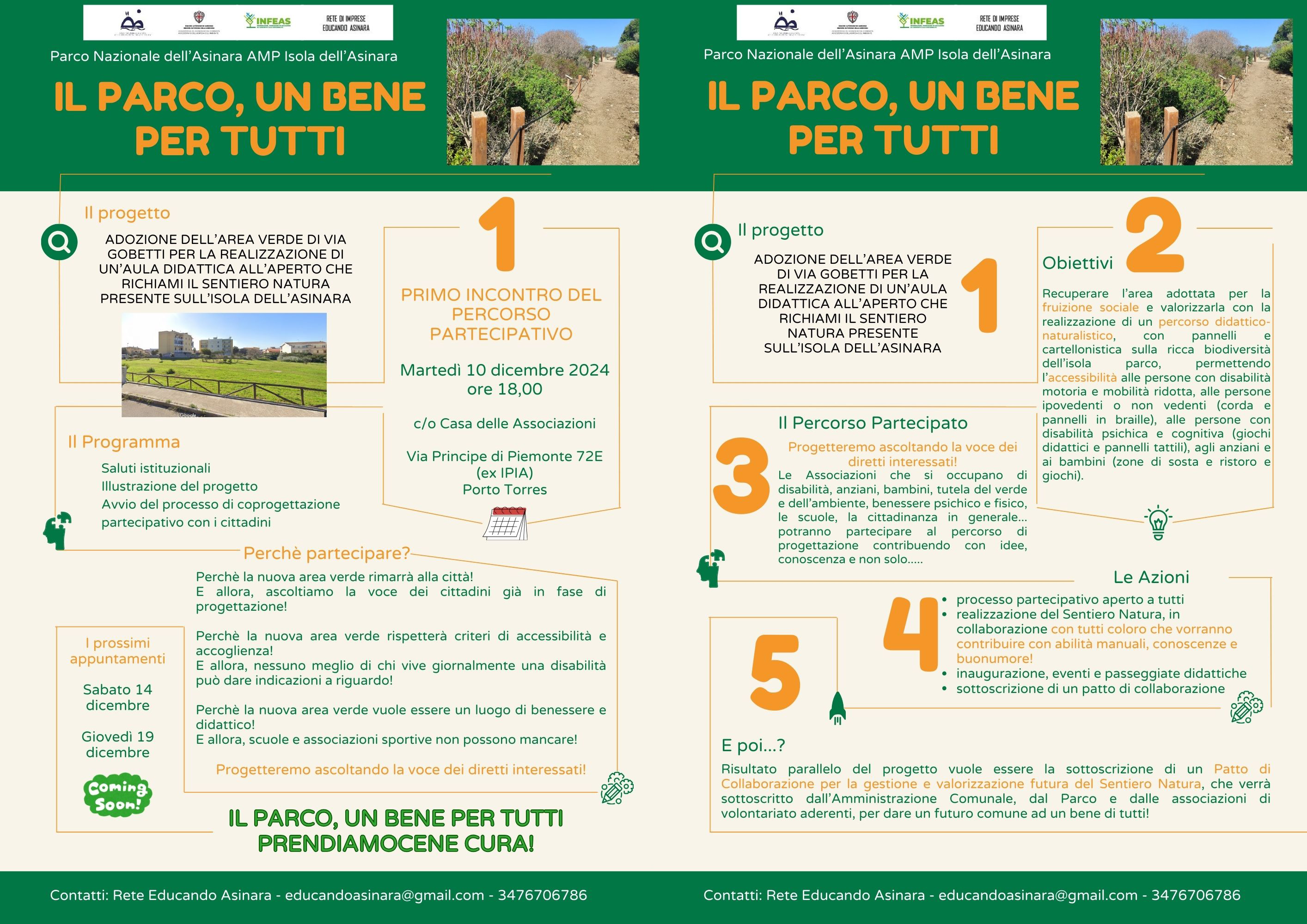 Martedì 10 dicembre 2024 alle ore 18.00, presso la “Casa delle Associazioni” (via Principe di Piemonte 72E), inizierà un percorso di progettazione partecipata nell'ambito del progetto Il Parco, un bene per tutti del Parco Nazionale dell'Asinara, in partenariato con il Comune di Porto Torres.