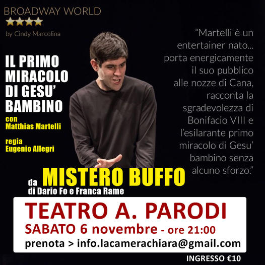 Dopo il successo di pubblico de S’accabadora, il Parodi prosegue con la sua programmazione ospitando il giovane talento Matthias Martelli che si sta imponendo da qualche anno nel panorama teatrale nazionale.