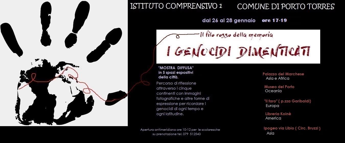 La Scuola Secondaria Brunelleschi, con la partecipazione di alcune classi della scuola Primaria, al fine di mantenere viva la memoria di alcune pagine buie della storia dell’umanità, organizza una “mostra diffusa” nei giorni che precedono e che seguono il 27 Gennaio, dal titolo “Il filo rosso della memoria: i genocidi dimenticati”. L’esposizione offrirà la possibilità di far conoscere ai cittadini le vittime di altri genocidi che invece sono stati dimenticati, in un percorso di riflessione attraverso i 5 continenti, a dimostrazione del fatto che l’orrore non conosce confini di spazio e di tempo. Gli studenti hanno realizzato degli approfondimenti visibili su pannelli espositivi (inquadramento storico, geografico e culturale; testimonianze e documenti relativi ai genocidi) che saranno a corredo del materiale fotografico d’archivio.