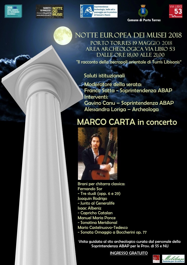 In occasione della quattordicesima edizione della Notte Europea dei Musei, la Soprintendenza Archeologia, belle arti e paesaggio per le province di Sassari e Nuoro (MiBACT), in collaborazione con la Fondazione Via Libio 53, proprietaria dello stabile in cui ricade l'area archeologica omonima, propongono una serata all'insegna della musica e dell'archeologia.