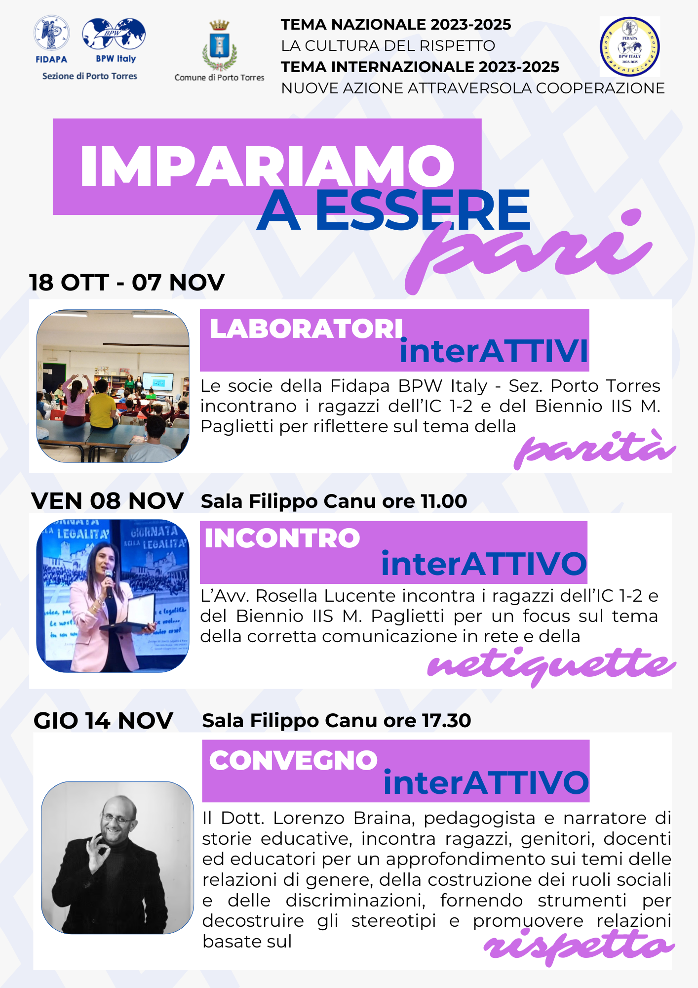 Il progetto ha preso il via con una serie di laboratori tenuti dalle socie della Fidapa BPW Italy - sezione di Porto Torres con gli alunni degli Istituti Comprensivi n° 1 e n° 2 e del biennio della scuola secondaria di secondo grado dell'Istituto di Istruzione Superiore "Mario Paglietti" di Porto Torres.