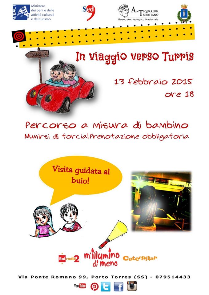 In occasione dell’Undicesima Giornata del Risparmio Energetico, “M’Illumino di meno”, a cura di Caterpillar Rai Radio2, si presenterà al pubblico il nuovo percorso didattico a misura di bambino, dal titolo “In viaggio verso Turris”, attraverso una visita guidata al buio, a cura del personale MiBACT. La prenotazione è obbligatoria telefonando al numero 079514433 o contattando lo staff sulla pagina ufficiale di Facebook.