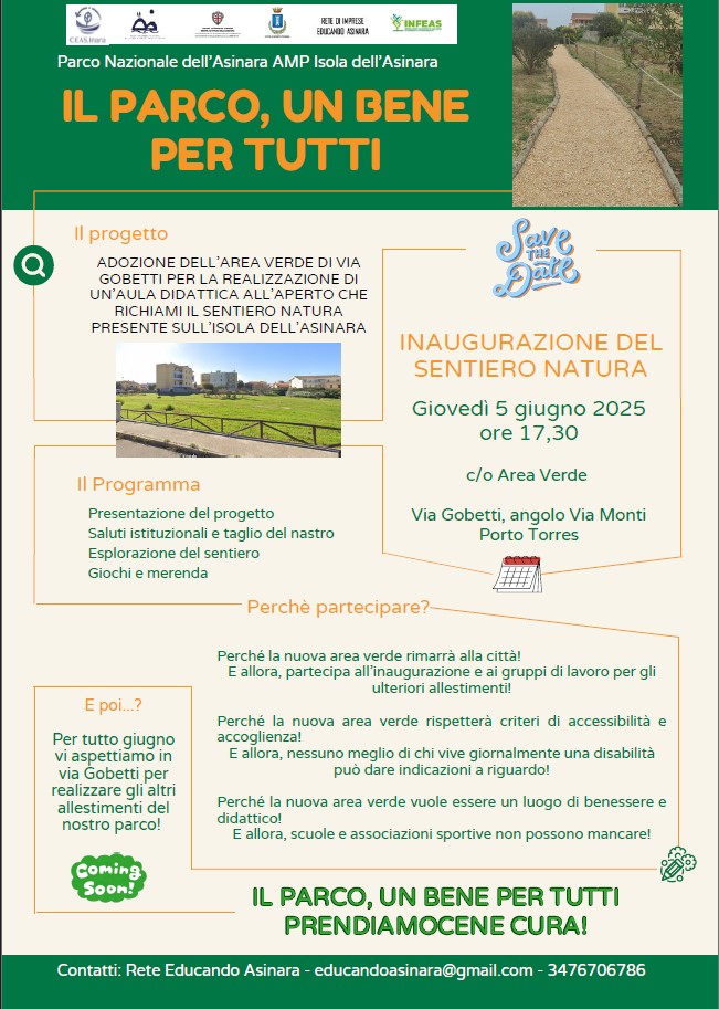 Giovedì 5 giugno alle ore 17:30 verrà inaugurato il nuovo Sentiero Natura con Aula Didattica all’Aperto, realizzato nell’area verde di Via Gobetti (angolo Via Monti) realizzato e curato dalla rete Educando Asinara che racchiude gli educatori ambientali dell’Ente Parco nell’ambito del progetto “Il Parco, un bene per tutti”, promosso dal Parco Nazionale dell’Asinara in collaborazione con il Comune di Porto Torres e finanziato dalla Regione Autonoma della Sardegna.