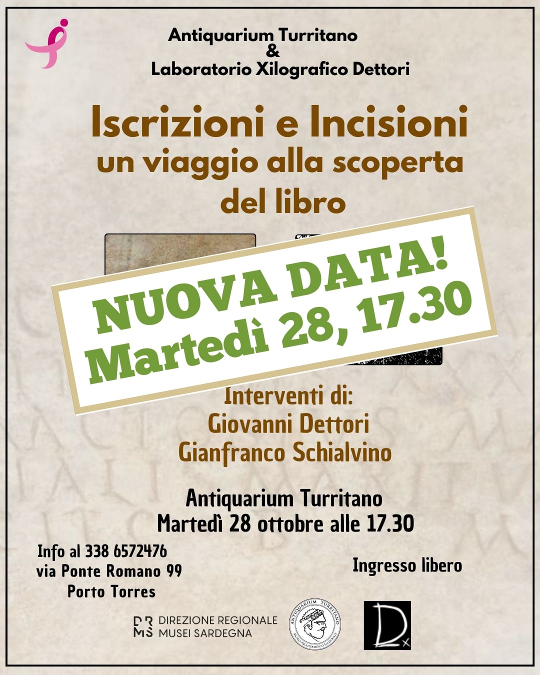 Il 28 ottobre alle ore 17:30, presso l’Antiquarium Turritano, si terrà la conferenza "Iscrizioni e Incisioni. Un viaggio alla scoperta del libro". Con un’introduzione del direttore dell’Antiquarium Stefano Giuliani a seguire Giovanni Dettori, maestro incisore turritano e lo xilografo e storico dell'arte Gianfranco Schialvino ci parleranno delle epigrafi romane, la creazione della carta, le tecniche di stampa dei libri. La conferenza si inserisce in un ciclo di eventi avviato con una mostra alla Pinacoteca di Sassari organizzata in collaborazione con il laboratorio xilografico Dettori, "Xilografie fra Oriente ed Occidente", ancora in corso, e presso il laboratorio xilografico Dettori, dal 25 ottobre a Porto Torres.