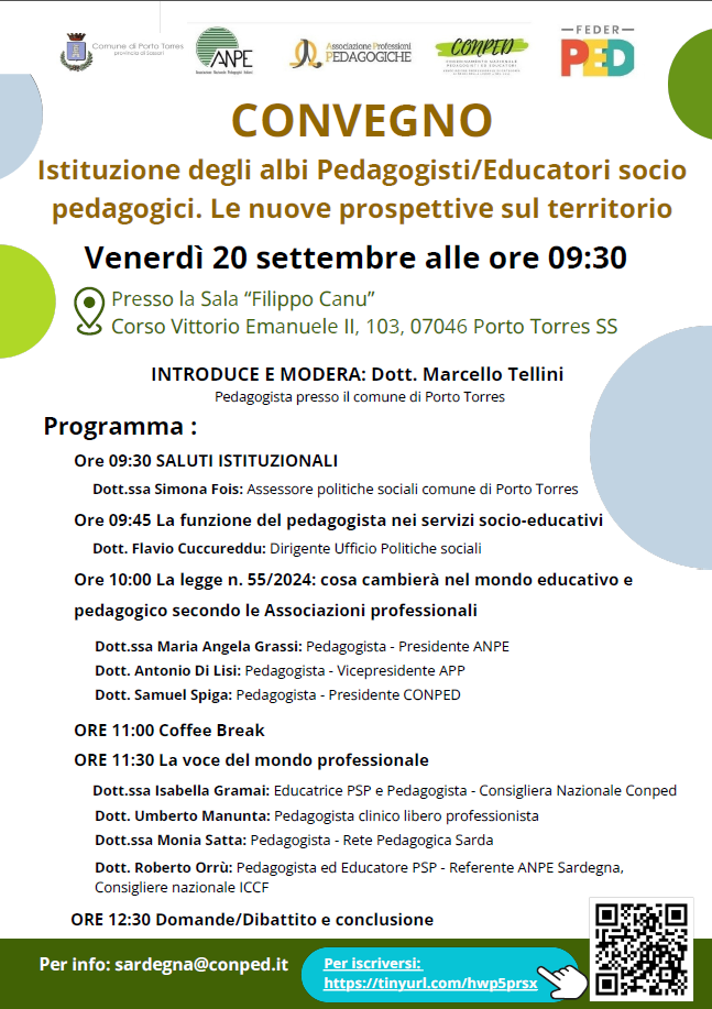 L’incontro, patrocinato dal Comune di Porto Torres, si inserisce nelle attività promosse su tutto il territorio nazionale dalle associazioni professionali CoNPEd (Coordinamento Nazionale Pedagogisti ed Educatori), APP (Associazione Professioni Pedagogiche) e ANPE (Associazione Nazionale Pedagogisti Italiani) e finalizzate alla massima divulgazione sul territorio della cultura e degli interventi in ambito educativo e pedagogico e alla diffusione di una corretta informazione sulla nuova normativa in vigore. Nello specifico, la mattinata di confronto vuole essere un’occasione per approfondire i riflessi che l’introduzione della Legge 55/2024 avrà nel futuro prossimo sulle politiche educative territoriali.
