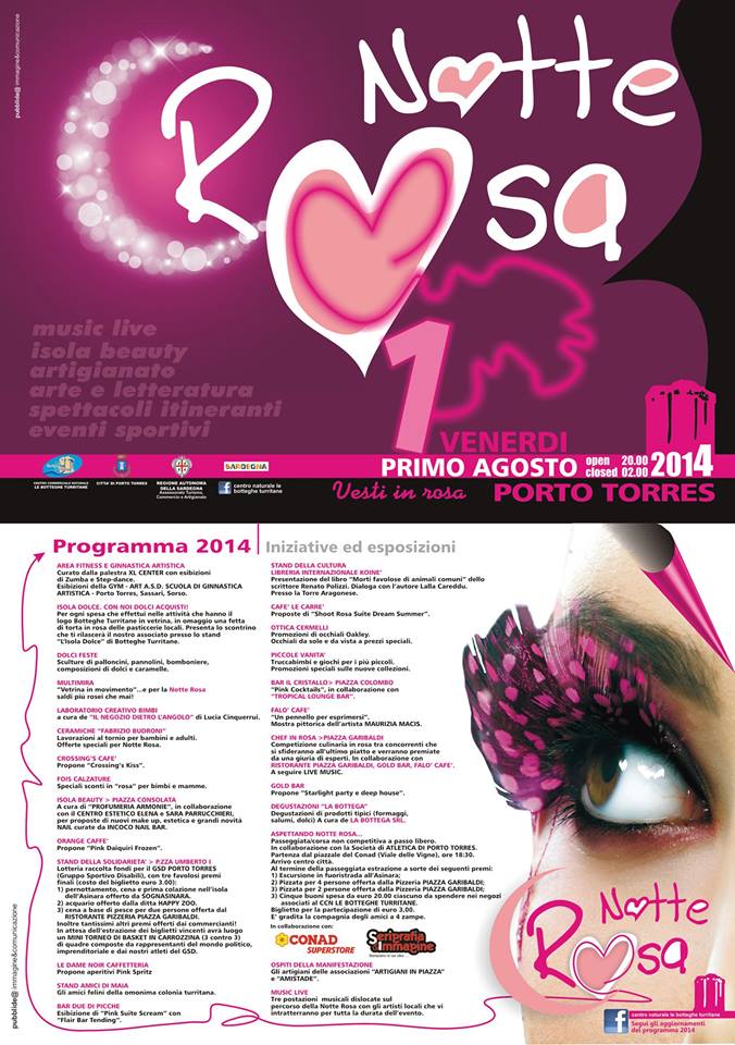 Nella Notte Rosa 2014 verranno proposti aperitivi, degustazioni, reading letterari, esibizioni musicali in tutto il Corso Vittorio Emanuele. Per la prima volta ci sarà anche un prologo con la passeggiata non competitiva che comincerà nel piazzale di via delle Vigne (parcheggio Conad) e proseguirà sulla litoranea, fino ad arrivare al giardino della Torre Aragonese. C’è anche tanto sport nella notte di Porto Torres con il torneo di basket in carrozzina e l’area dedicata al fitness, in cui sono previste esibizioni di zumba, step dance e ginnastica artistica. Gli organizzatori non hanno dimenticato i più piccoli, i quali potranno frequentare i laboratori creativi e dedicarsi ad attività ludiche. Non mancheranno le degustazioni di prodotti tipici e gli stand espositivi delle attività commerciali. Tutti sono invitati a vestirsi o a indossare capi e accessori rigorosamente rosa.