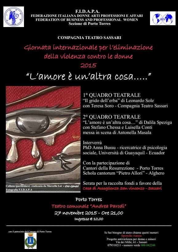 La F.I.D.A.P.A. (Federazione Italiana Donne Arti Professioni e Affari), Sezione di Porto Torres e la Compagnia Teatro Sassari presentano “L’amore è un’altra cosa….” durante la Giornata internazionale per l’eliminazione della violenza contro le donne 2015.