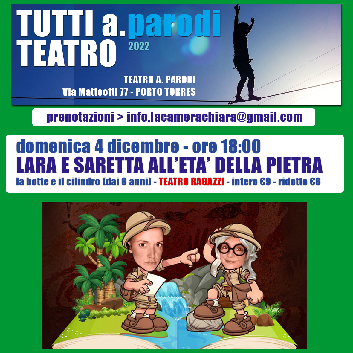 la rassegna Tutti a Teatro organizzata dalla compagnia La Camera Chiara porta in scena lo spettacolo di teatro per ragazzi Lara e Saretta all'età della Pietra della compagnia La botte e il cilindro. Scritto da Luca Dettori. Diretto e interpretato da Bianca Maria Lay e Daniela Simula. Fonica di Aldo Milia. In collaborazione con Mario Chessa e Stefano Cossu.