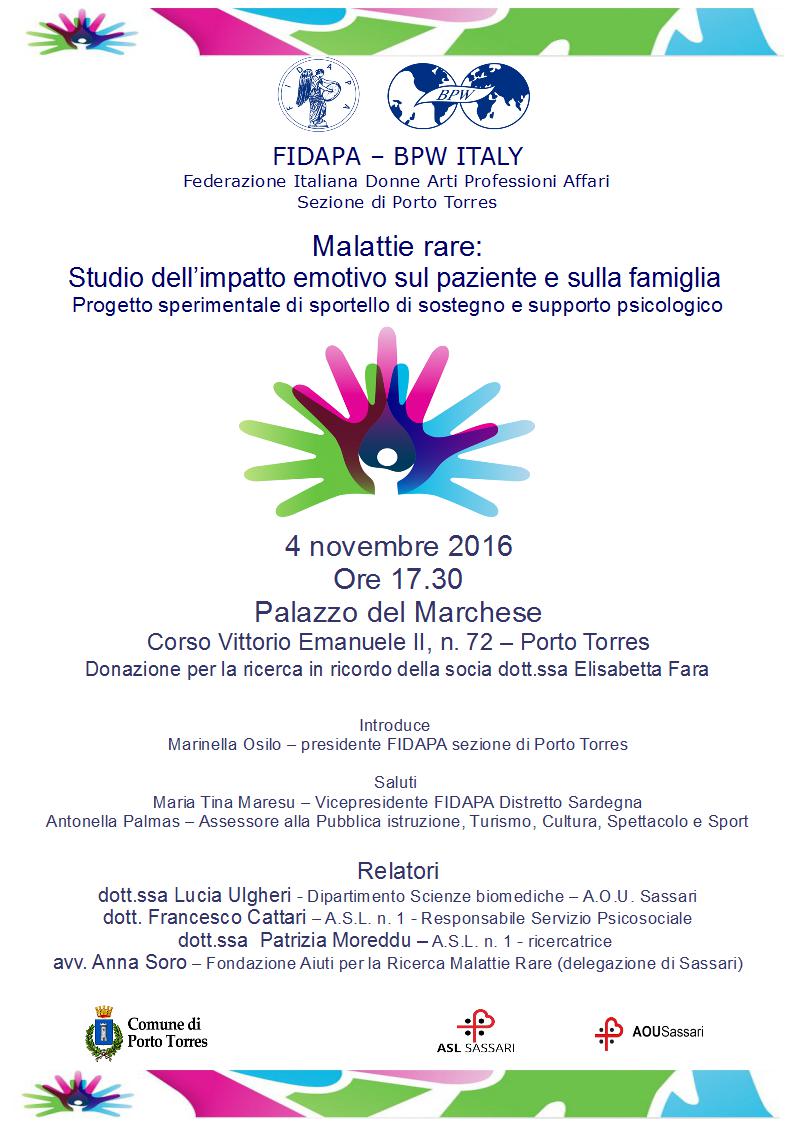Il convegno rappresenta l'atto conclusivo del lavoro svolto in due anni dalla dott.ssa Patrizia Moreddu, ricercatrice presso la ASL, sul tema delle malattie rare grazie anche alla donazione assegnatale dalla FIDAPA – sezione di Porto Torres nel novembre del 2014. La donazione deriva dalla raccolta fondi operata dalla stessa associazione grazie alla manifestazione sportiva la Barcolana Turritana ed è stata istituita in ricorda della socia dott.ssa Elisabetta Fara.