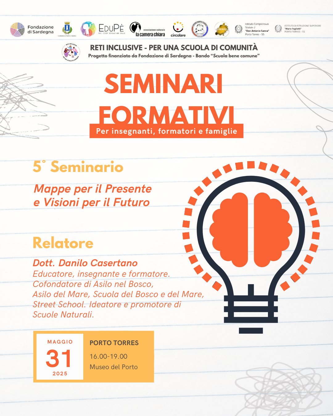 Il seminario Mappe per il presente e Visioni per il futuro è tenuto dal Dott. Danilo Casertano – Educatore, insegnante e formatore. Cofondatore di Asilo nel Bosco, Asilo del Mare, Scuola del Bosco e del Mare, Street School. Ideatore e promotore di Scuole Naturali.