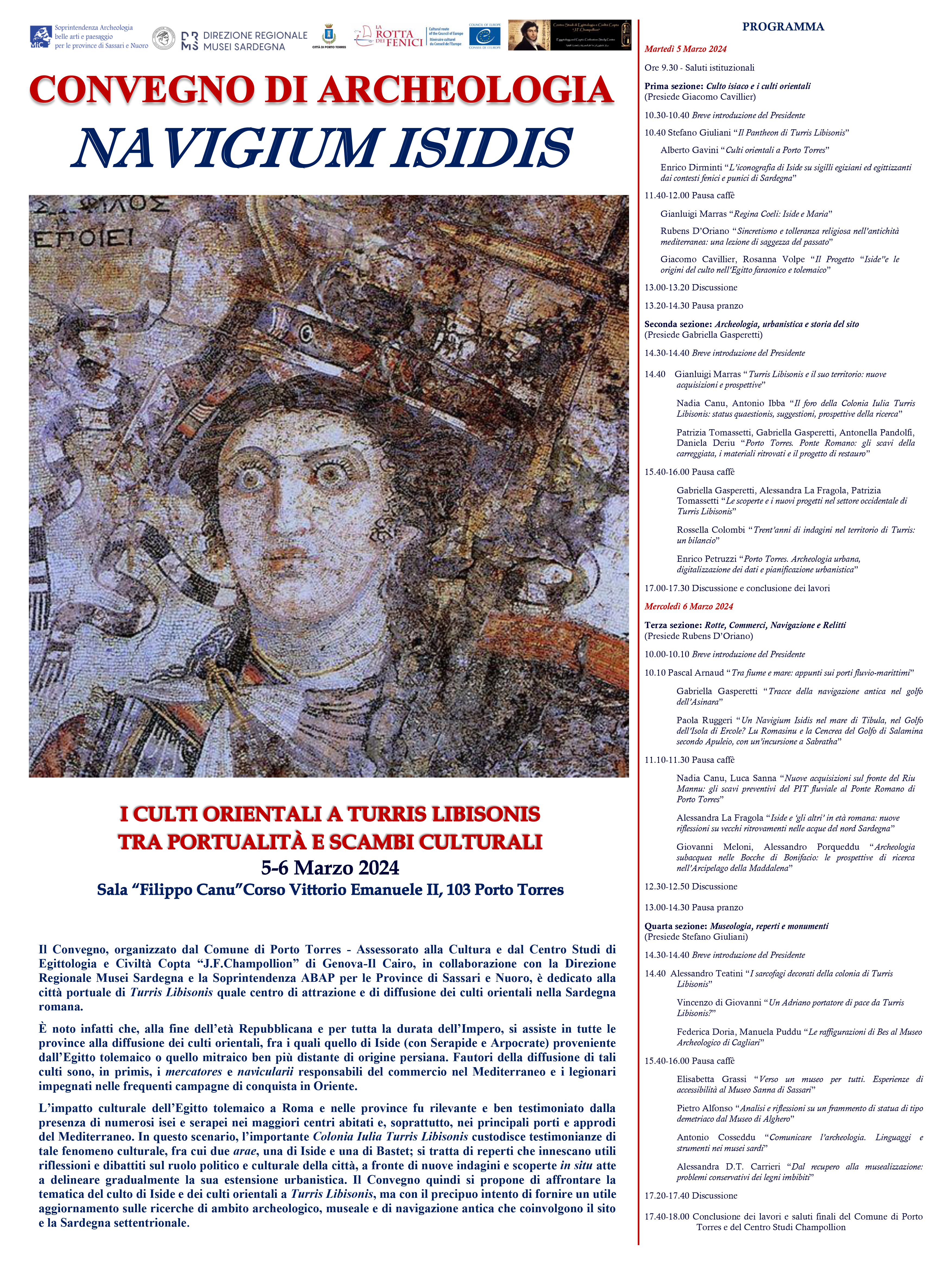 Il Comune di Porto Torres - Assessorato alla Cultura e il Centro Studi di Egittologia e Civiltà Copta “J.F.Champollion” con sede a Genova e il Cairo hanno organizzato l’evento in collaborazione con la Direzione Regionale Musei Sardegna e la Soprintendenza ABAP per le Province di Sassari e Nuoro con l’obiettivo di promuovere e valorizzare lo studio della Colonia Iulia Turris Libisonis e dei suoi rapporti con l’Egitto e il Mediterraneo Orientale, evidenziando il ruolo chiave dell'antica città di Porto Torres nel commercio e nella diffusione dei culti orientali durante l'epoca imperiale.