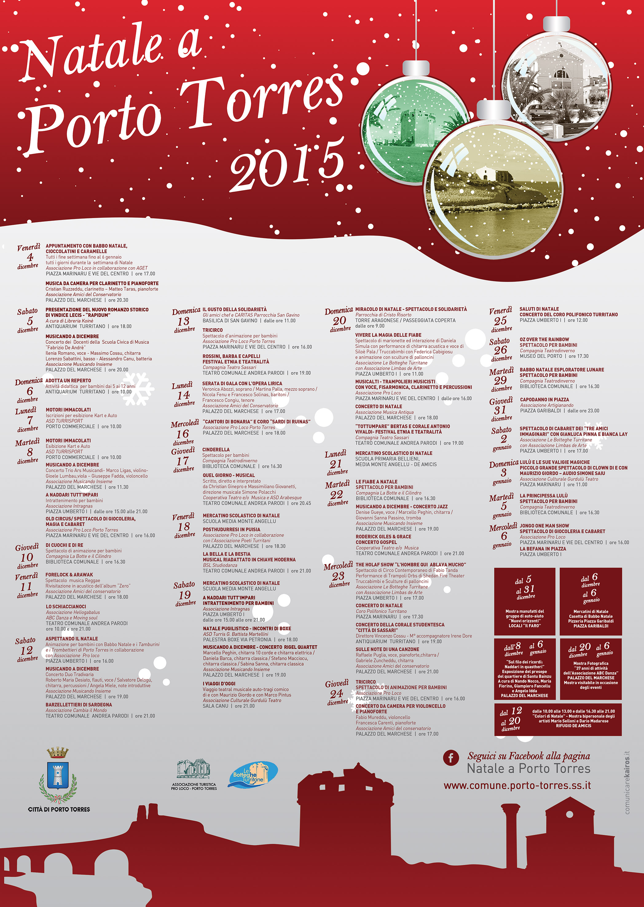 Eventi per i più piccoli, spettacoli teatrali, concerti, musical e appuntamenti solidali. Tante le novità nell'edizione 2015 della rassegna “Natale a Porto Torres”, in programma dal 4 dicembre al 6 gennaio. Tra le sedi scelte per ospitare la manifestazione fanno il loro esordio il Palazzo del Marchese, all’interno del quale ci saranno esposizioni e concerti, e Piazza Bazzoni Marinaru, area tra via Petronia e via Libio che sarà dedicata soprattutto agli appuntamenti per i più piccoli. Per la prima volta, in occasione di alcune manifestazioni, sarà creato anche un circuito pedonale proprio nella via Libio, cuore del centro storico di Porto Torres. Gli eventi sono organizzati dall’amministrazione comunale insieme alle associazioni e agli operatori culturali ed economici.
