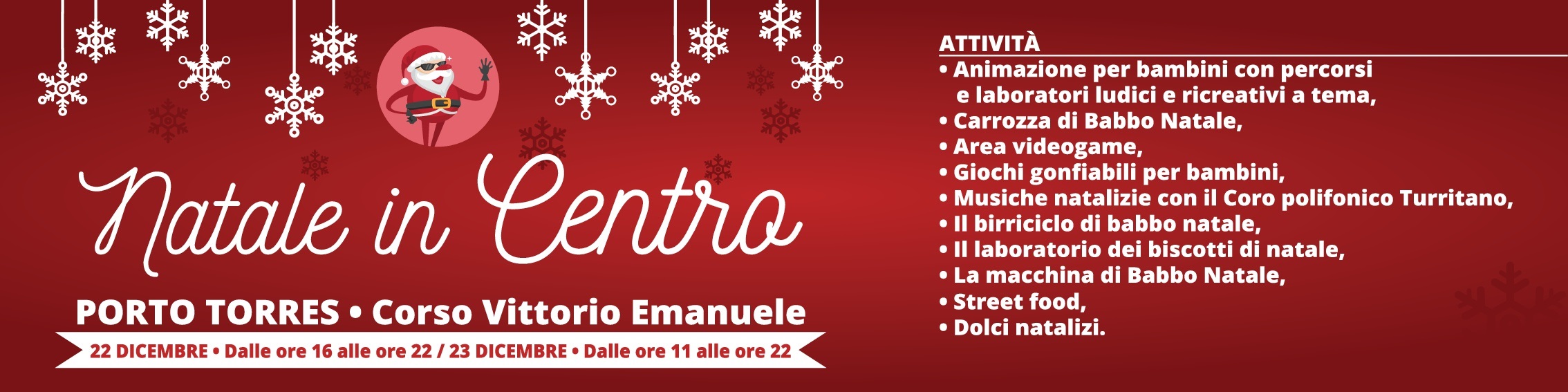Il 22 e il 23 dicembre il centro di Porto Torres si riempirà di musica, suoni e sorprese. Natale in Centro sarà un contenitore di intrattenimento che, a ridosso della vigilia, allieterà i cittadini nelle vie dello shopping. Tante le attività previste per giovani e famiglie. Tra queste l'animazione per bambini con percorsi e laboratori ludici e ricreativi a tema, un'area dedicata ai videogame e uno spazio per i giochi tanto amati da più piccoli. Ma non è tutto! Nelle vie transiterà Babbo Natale, ci saranno i laboratori dei biscotti, le degustazioni di dolci e le delizie del palato sottoforma di street food.