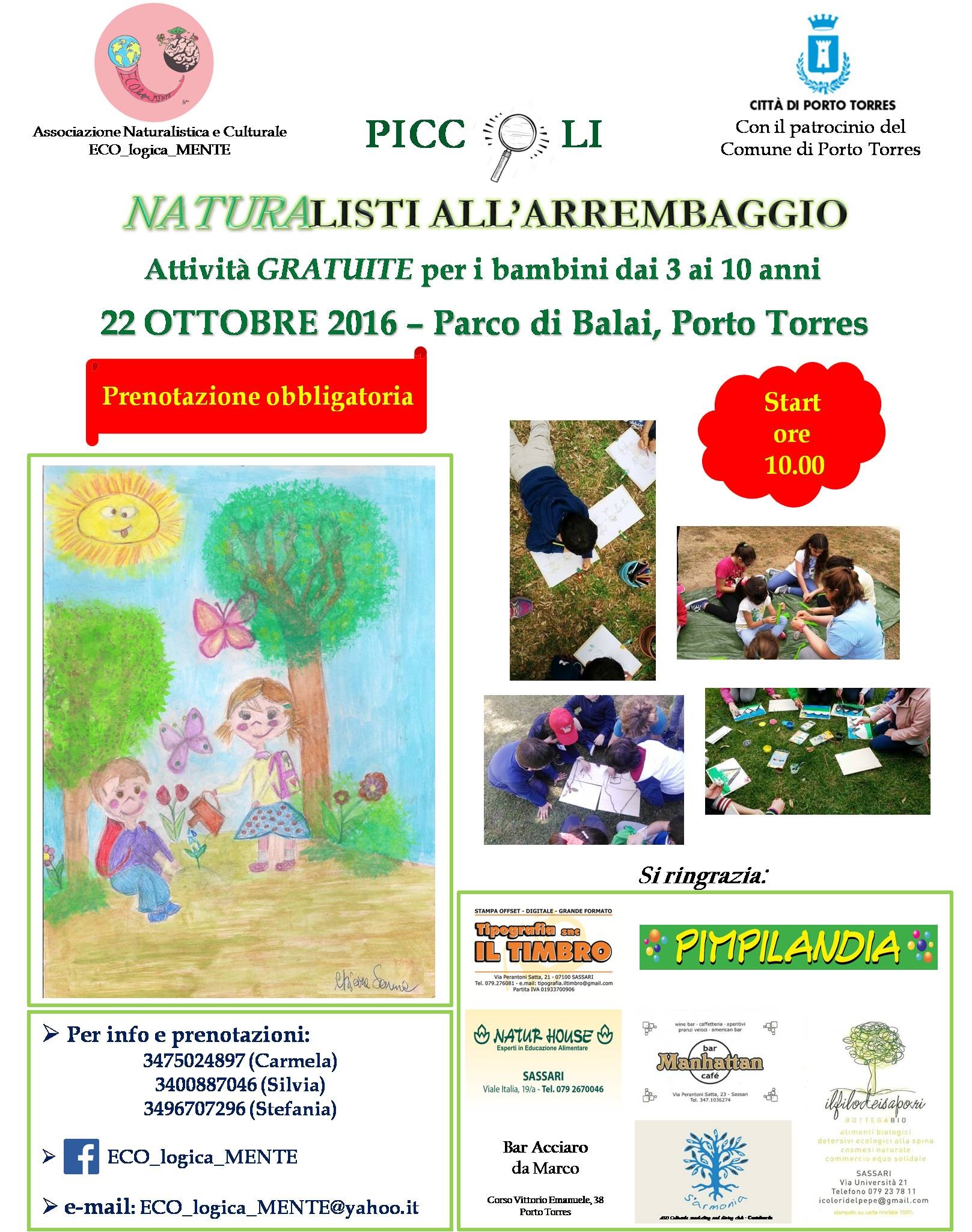 Tante attività di educazione ambientale per i piccoli, sabato 22 ottobre, nel Parco di Balai. L'iniziativa, patrocinata dal Comune di Porto Torres, organizzata dall'associazione ECO_logica_MENTE, è rivolta ai bimbi dai 3 ai 10 anni ed è gratuita. E' obbligatoria la prenotazione ai numeri: 347 5024897 (Carmela); 340 0887046 (Silvia); 349 6707296 (Stefania).
