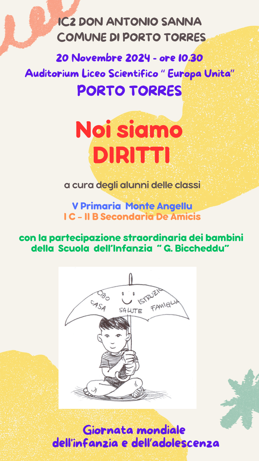 In occasione del XXXV anniversario della Convenzione dei Diritti dell’Infanzia e dell’Adolescenza, mercoledì 20 novembre 2024 alle ore 10.30, nell’Auditorium del Liceo Scientifico “Europa Unita”, si svolgerà l’evento: “Noi siamo…Diritti”, progetto in continuità tra le classi V Primaria Monte Angellu, I C Secondaria De Amicis e con la partecipazione della sezione dell’Infanzia “Biccheddu”.