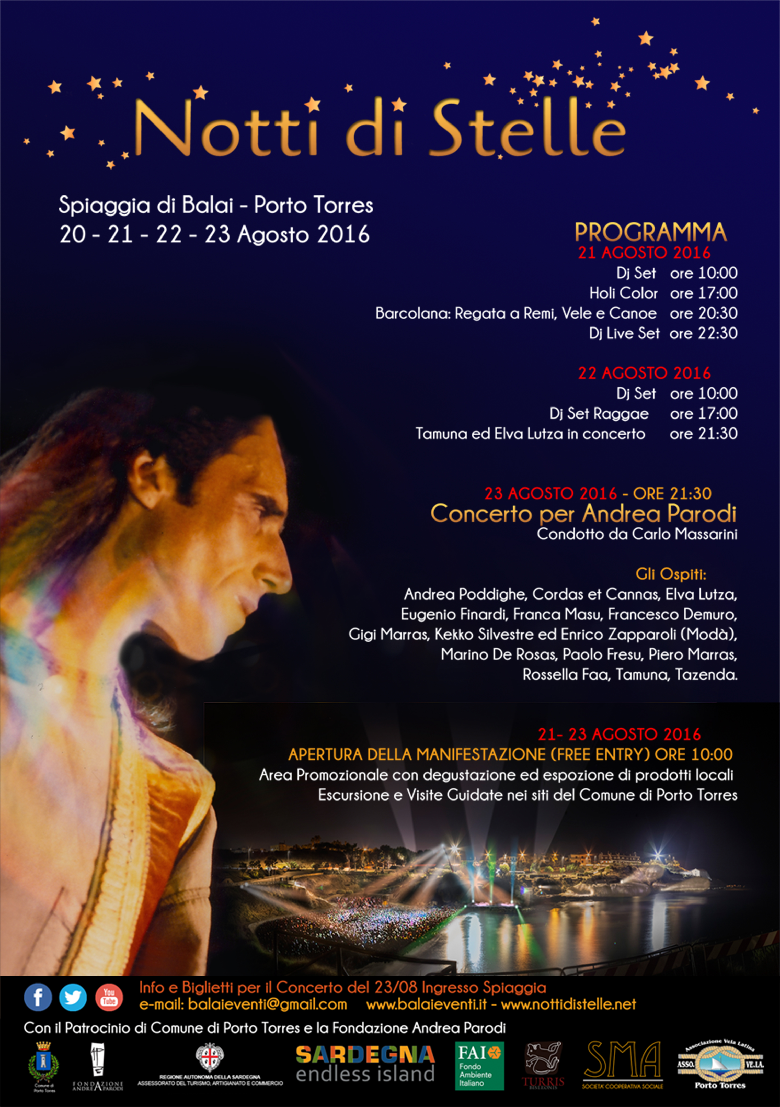 In questa prima Edizione di “Notti di Stelle” partecipano le attività che operano nel Comune di Porto Torres, sia in onore di Andrea Parodi che per riqualificare l’area dell’incantevole Spiaggia di Balai.