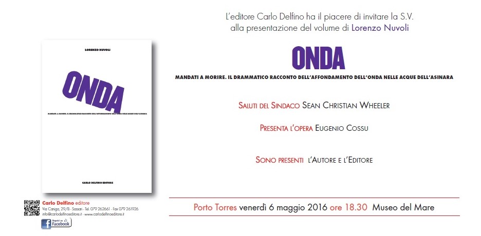 Nel giorno del 73° anniversario dall'affondamento sarà presentato il libro di Lorenzo Nuvoli "Onda. Mandati a morire. Il drammatico racconto dell'affondamento dell'Onda nelle acque del Golfo dell'Asinara", pubblicato dalla Delfino Editore. L'evento sarà introdotto da Eugenio Cossu, che parlerà dell'affondamento del motopeschereccio ad opera di un sommergibile inglese. Un episodio per molti anni rimasto oscuro e su cui ha provato a fare nuova luce Nuvoli, attraverso documenti inediti che fanno chiarezza sull'episodio e rendono giustizia alle vittime dell'equipaggio. In scaletta anche i saluti del sindaco Sean Wheeler.
