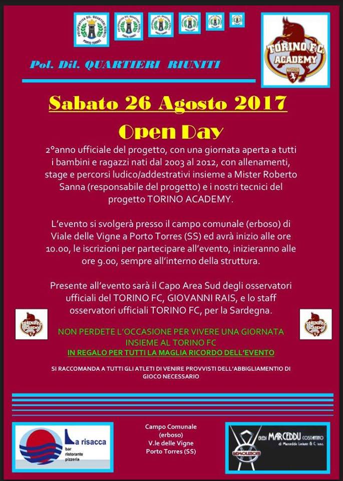 La Polisportiva Dilettantistica "Quartieri Riuniti", col patrocinio del Comune di Porto Torres, organizza la seconda edizione dell’Open Day, una giornata calcistica aperta a tutti i bambini e ragazzi nati dal 2003 al 2012, con allenamenti, stage e percorsi ludico-addestrativi insieme al responsabile del progetto Mister Roberto Sanna e ai tecnici del progetto Torino Academy.