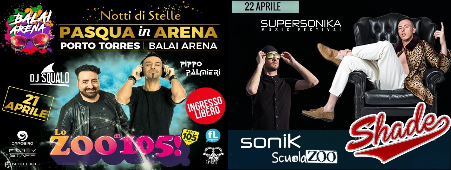 Saranno Shade e la squadra dello Zoo di 105 gli ospiti più attesi di "Pasqua in Arena” la rassegna in programma dal 21 aprile a Porto Torres nella cornice della spiaggia di Balai. Ad organizzare l'evento sono l’Associazione culturale Notti di Stelle, coadiuvata da tutto lo staff di scuola Zoo, FL Comunicazione, Area Mito, Supersonika e Privilege Event.