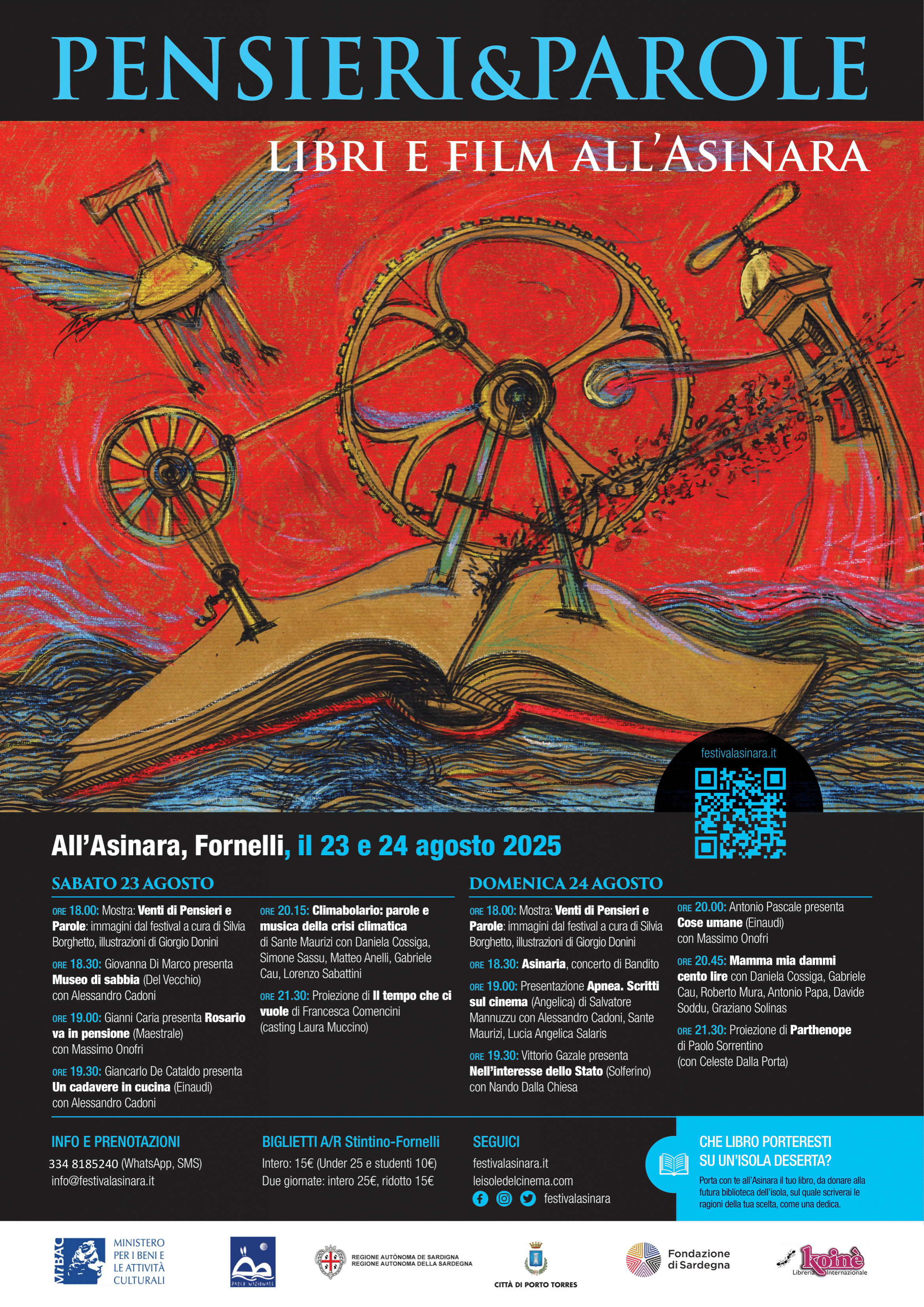 Il "Festival Pensieri e Parole" è un festival cinematografico che si svolge all'Asinara, in Sardegna, e celebra la cultura e l'impegno civile attraverso libri, musica e film. È un evento che si concentra su incontri, proiezioni e momenti di riflessione legati alla memoria e alla storia dell'isola. Il festival propone proiezioni di film, incontri con autori, dibattiti e momenti di approfondimento culturale, spesso legati alla storia e all'identità dell'Asinara. Si svolge in diverse location dell'isola, tra cui Sassari, Alghero e Porto Torres, con un'attenzione particolare alla zona dell'Asinara, inclusa la zona di Fornelli e il mare. Il festival si distingue per il suo impegno civile, affrontando temi legati alla memoria storica, alla giustizia e alla cultura.