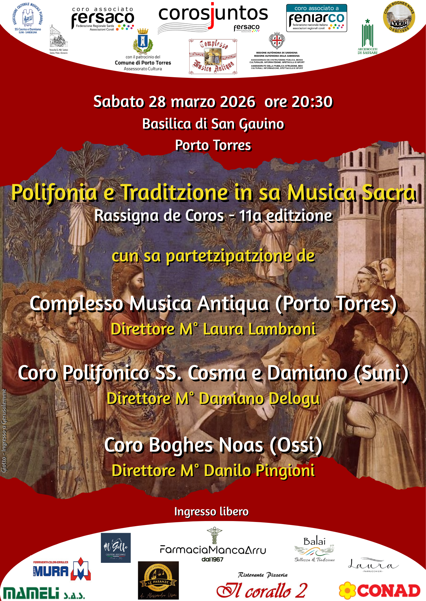 Alla rassegna di quest'anno parteciperanno il Coro Polifonico S.S. Cosma e Damiano di Suni diretto dal M° Damiano Delogu e il Coro Boghes Noas di Ossi diretto dal M° Danilo Pingioni. La serata sarà aperta dal Complesso Musica Antiqua che, sotto la Direzione del M° Laura Lambroni, darà il benvenuto musicale ai cori ospiti.