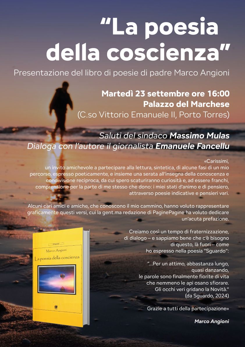 Martedì 23 settembre alle ore 16, il Palazzo del Marchese, sede istituzionale del Comune di Porto Torres, in Corso Vittorio Emanuele II, ospiterà la presentazione del libro di padre Marco Angioni “La poesia della coscienza”