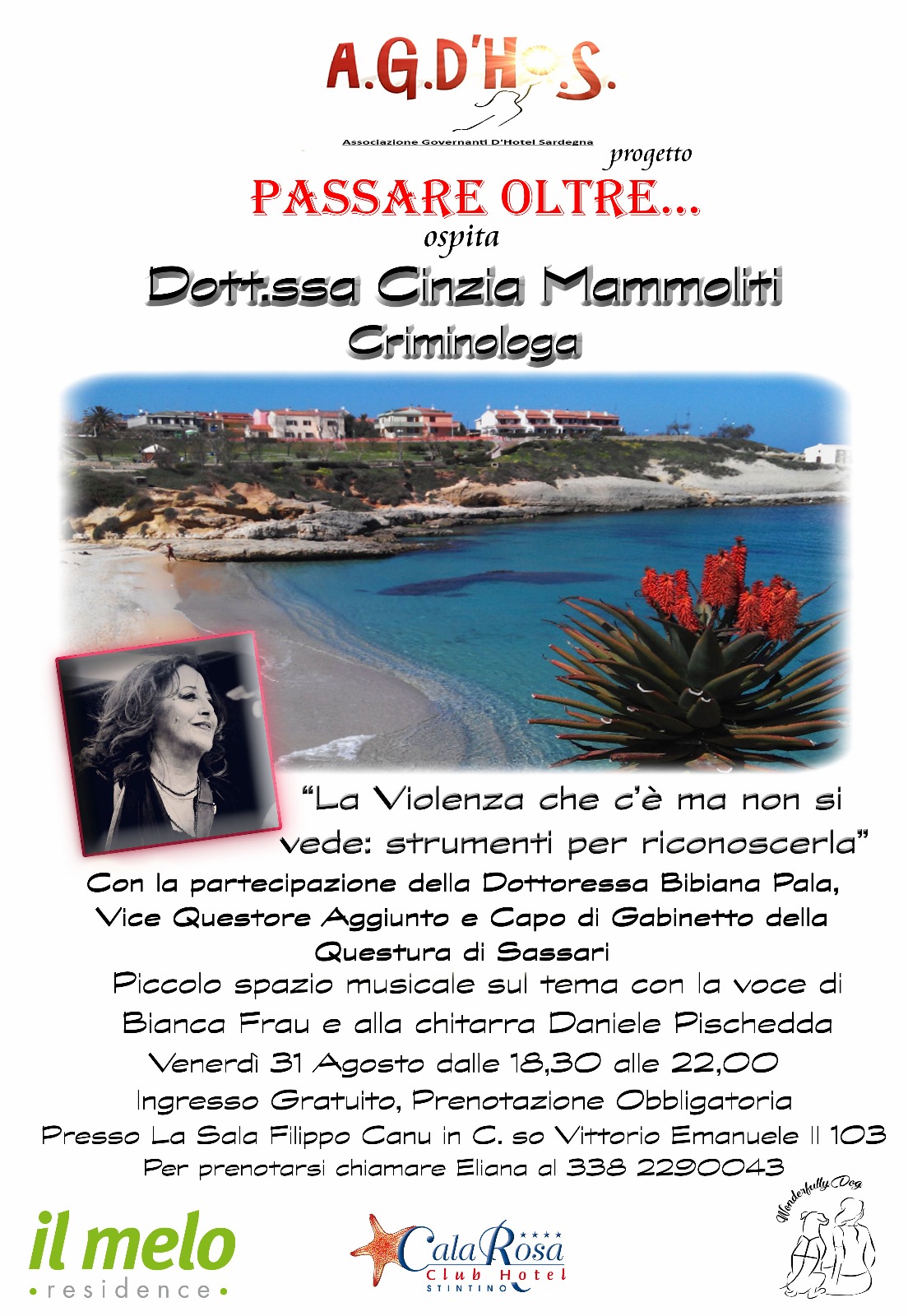 "La violenza che c'è ma non si vede: strumenti per riconoscerla" è il tema che sarà trattato a Porto Torres dalla criminologa Cinzia Mammoliti. Ha lavorato per molti anni con donne e minori vittime di violenza ed è Docente di Psicologia per la Scuola Superiore dell’Amministrazione dell'Interno e di Criminologia per il Polo Anticrimine Interforze. Collabora con Scuole di Polizia, Forze dell'Ordine, operatori di security, operatori del settore sanitario e sociale e di Sportelli Antiviolenza. E' tra i massimi esperti nazionali in materia di manipolazione relazionale e violenza psicologica ed è promotrice di un progetto di sensibilizzazione sulla violenza di genere attraverso la partecipazione a convegni, conferenze, seminari e workshop.