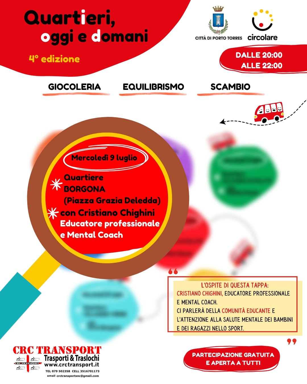Mercoledì 9 luglio, presso il Quartiere Borgona (piazza Grazia Deledda), dalle 20:00 alle 22:00, si terrà un intervento a cura di Cristiano Chighini, educatore professionale e mental coach. L'incontro sarà dedicato al tema della comunità educante e all’attenzione verso la salute mentale dei bambini e dei ragazzi nello sport.