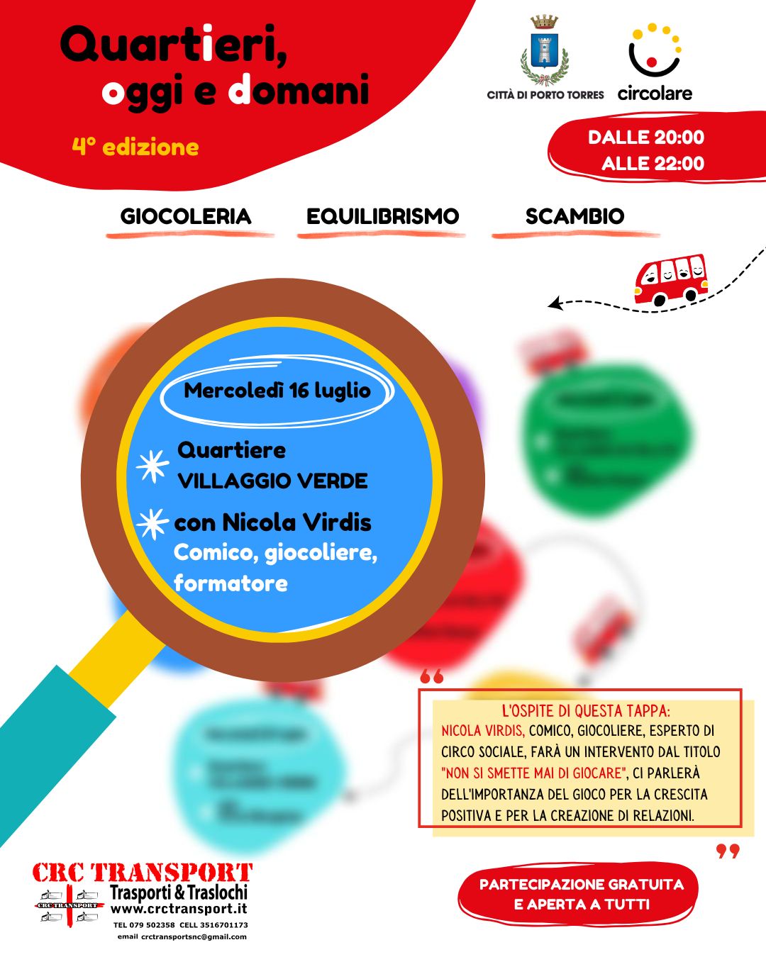 Mercoledì 16 luglio presso il Quartiere Villaggio Verde (Piazza 1° Maggio) sarà con noi Nicola Virdis, comico, giocoliere, formatore ed esperto di Circo Sociale, farà un intervento dal titolo "Non si smette mai di giocare", ci parlerà dell'importanza del gioco per la crescita positiva e per la creazione di relazioni.