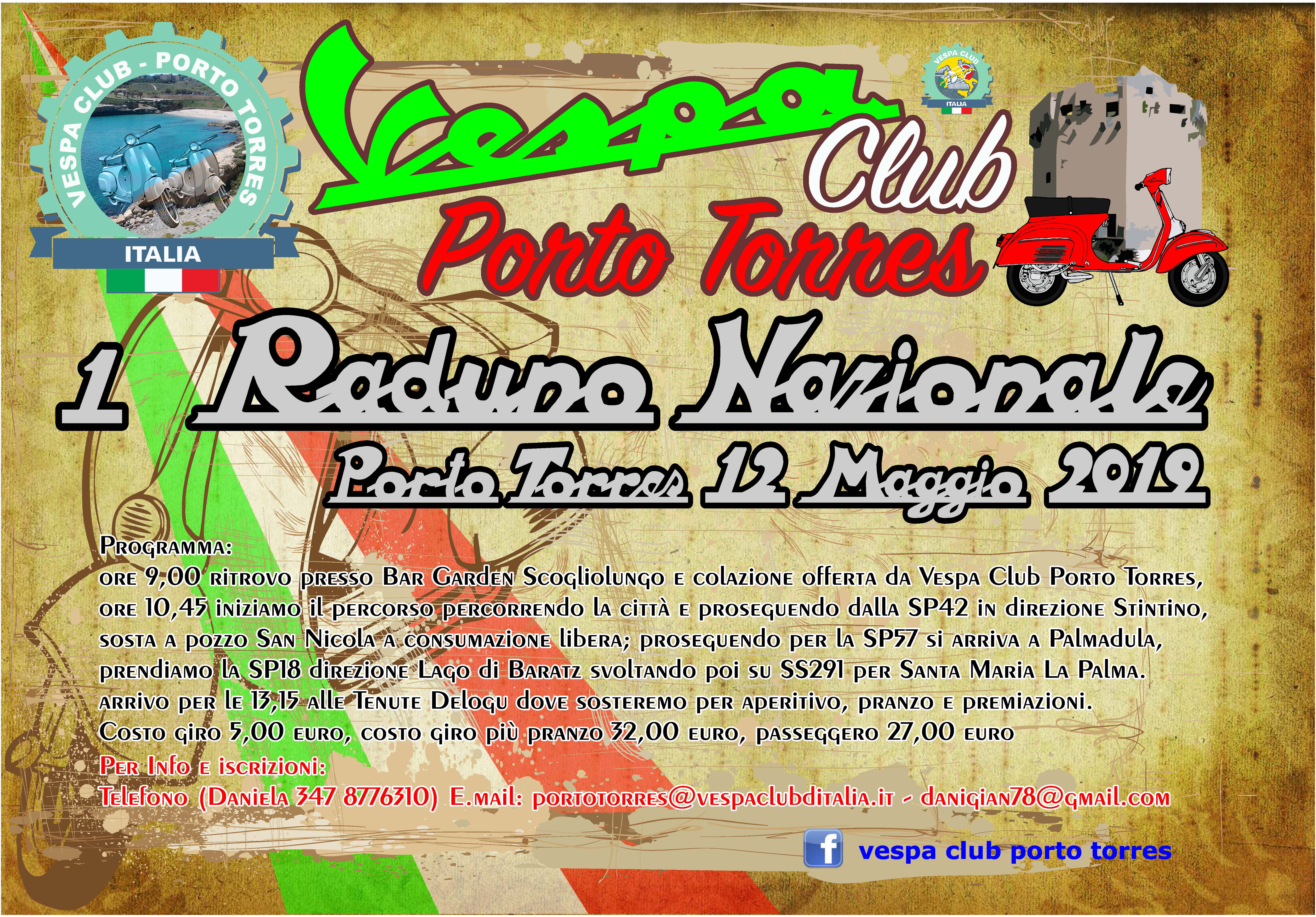 Il Vespa Club Porto Torres organizza il primo raduno nazionale con base in città, che si svolgerà domenica 12 maggio 2019. Il programma prevede il ritrovo alle ore 9:00 presso il Bar Scogliolungo, con colazione offerta da Vespa Club Porto Torres. Alle 10:45 le moto percorreranno le vie di Porto Torres e proseguiranno verso la SP 42 in direzione Stintino, con sosta a Pozzo San Nicola a consumazione libera. Proseguendo per la SP 57 si arriverà a Palmadula e si svolterà per la SP 18 in direzione Lago di Baratz. I partecipanti percorreranno poi la SS 291 per Santa Maria La Palma. Alle 13:15 è previsto l'arrivo nelle tenute Delogu.