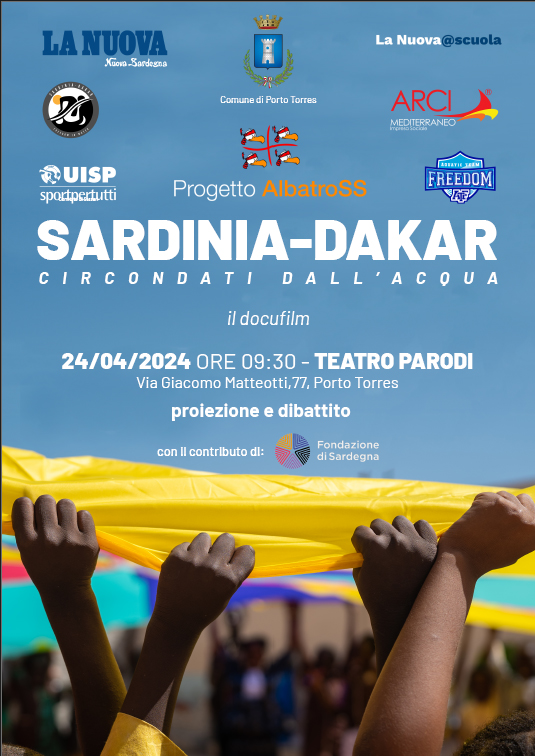 Proiezione del docufim “Sardinia-Dakar, circondati dall’acqua”, video-racconto del progetto sportivo-umanitario realizzato in Senegal lo scorso novembre dall’Associazione Sportiva Progetto ALbatroSS, che mira alla costruzione di un ponte transculturale tra Sardegna e Senegal e, in particolare, tra la città di Porto Torres (con l’Isola dell’Asinara) e Gorèe (Isola degli schiavi Patrimonio Mondiale dell’Unesco).