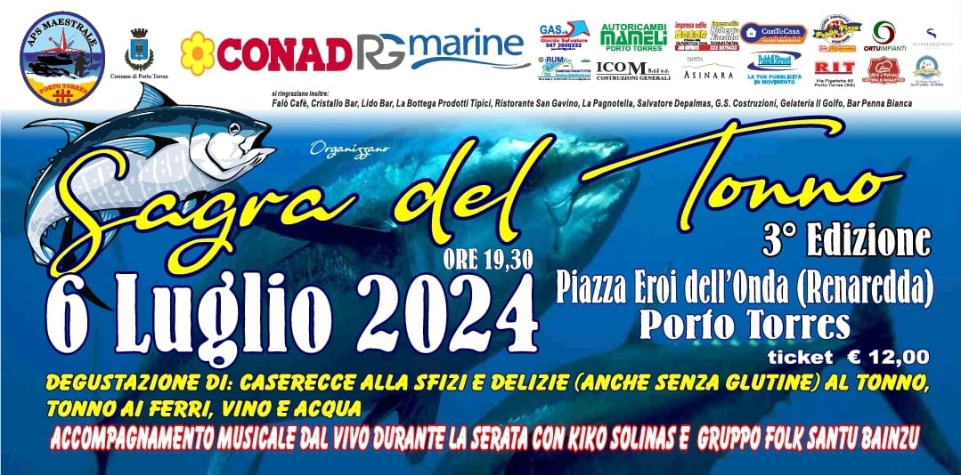 Ritorna anche quest'anno la sagra del tonno. Durante la serata sarà possibile degustare delle caserecce alla sfizi e delizie (anche senza glutine) al tonno, dei tranci di tonno ai ferri, il tutto accompagnato da vino e acqua.