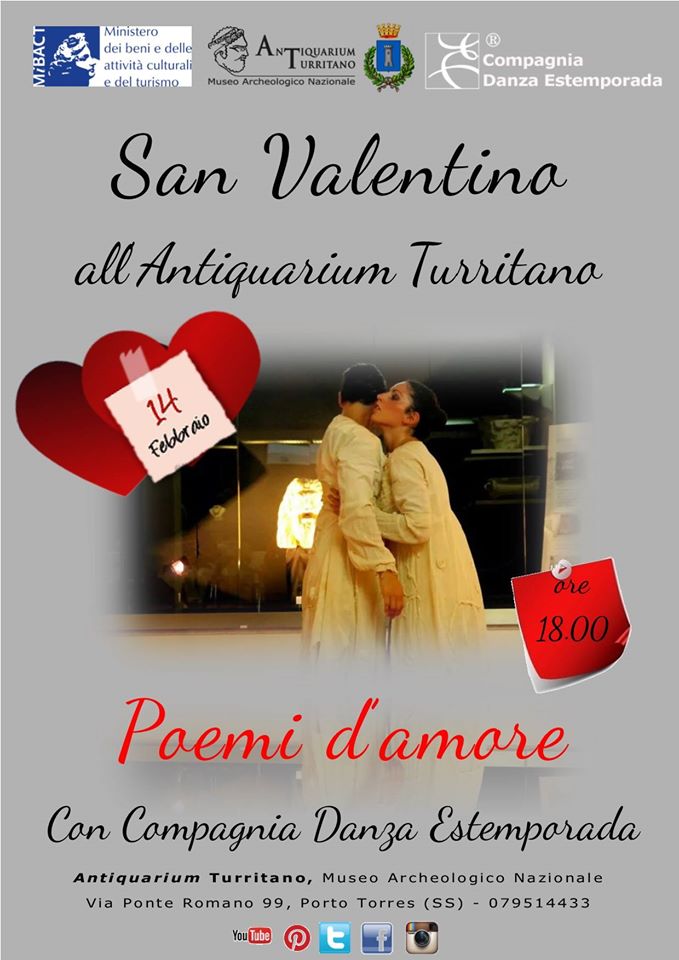 Per il giorno di San Valentino, l’Antiquarium propone uno spettacolo di danza, “Poemi d’amore”, che trae ispirazione dal “Cantico dei Cantici”, a cura della Compagnia Danza Estemporada. La metodologia teatrale che si intende utilizzare è la danza contemporanea, che permette forme espressive ampie e vicine all’attualità che ci circonda e permette di tradurre con il gesto la poesia. Da qui, una scena fatata in cui danzatori si snodano in movimenti lunghi, fluidi e armoniosi. Coreografia e regia a cura di Livia Lepri.